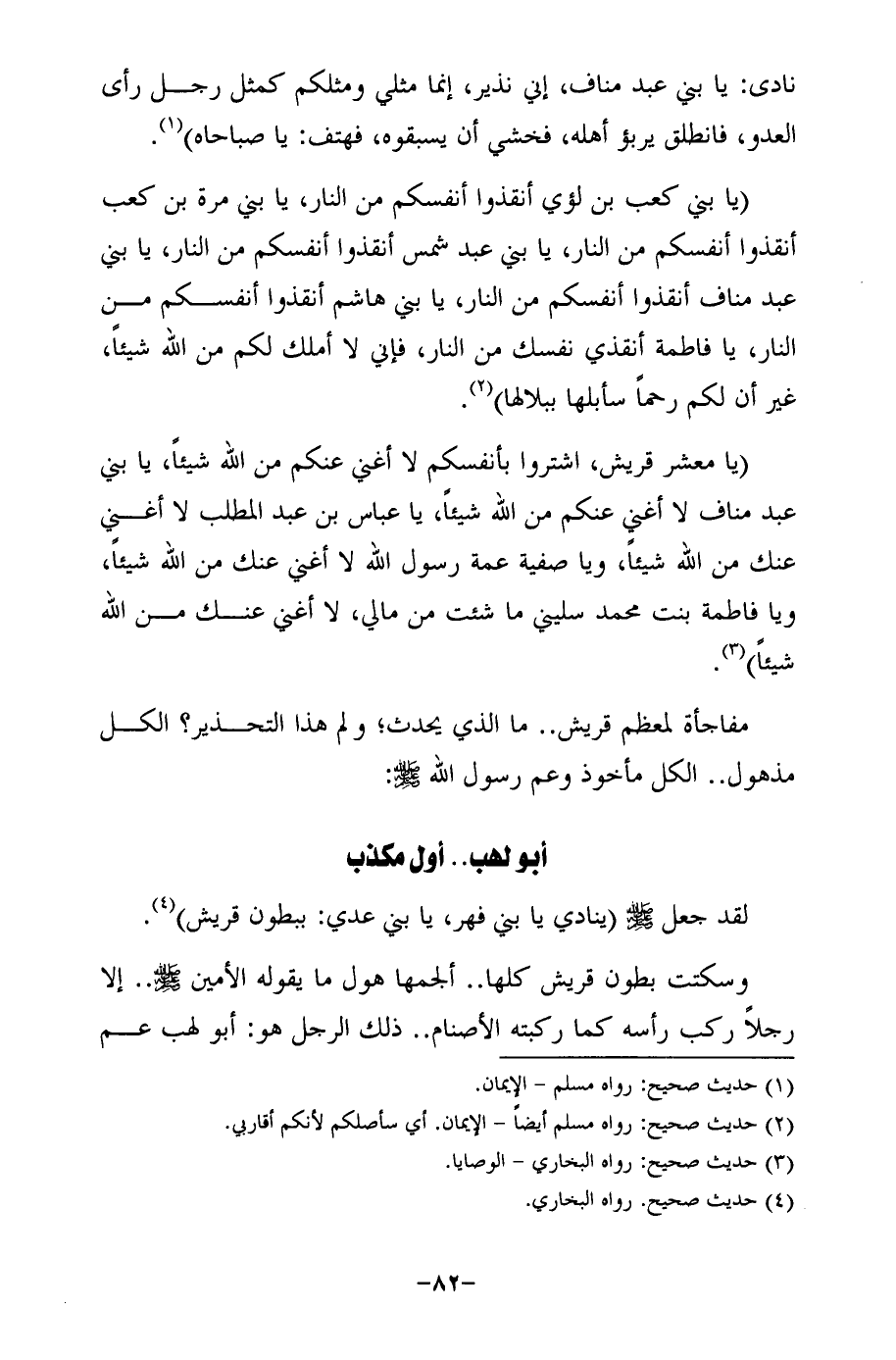 (يا بني كعب بن لؤي أنقذوا أنفسكم من النار، يا بني مرة بن كعب أنقذوا أنفسكم من النار، يا بني عبد شمس أنقذوا أنفسكم من النار، يا بني عبد مناف أنقذوا أنفسكم من النار، يا بني هاشم أنقذوا أنفسكم من النار، يا فاطمة أنقذي نفسك من النار، فإني لا أملك لكم من الله شيئًا، غير أن لكم رحمًا سأبلها ببلالها) (¬2).