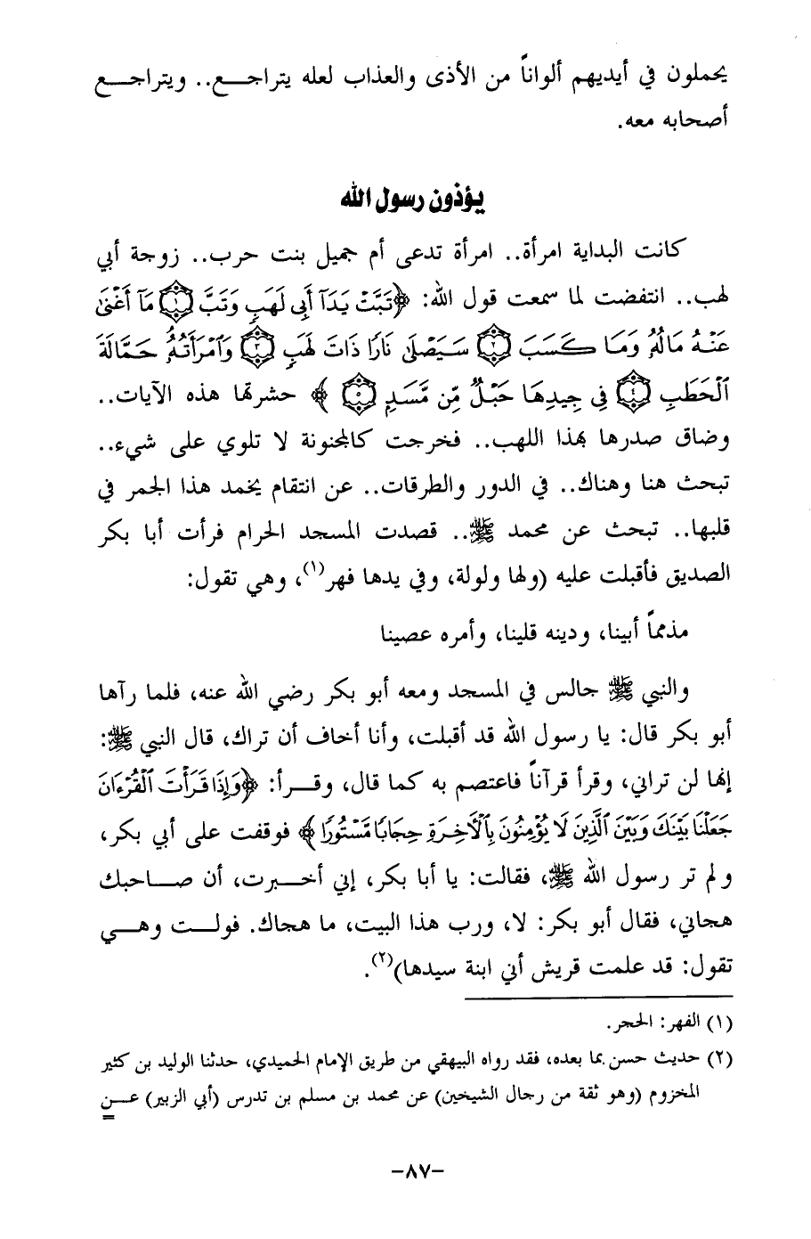 والنبي -صلى الله عليه وسلم- جالس في المسجد ومعه أبو بكر رضي الله عنه، فلما رآها أبو بكر قال: يا رسول الله قد أقبلت، وأنا أخاف أن تراك، قال النبي-صلى الله عليه وسلم-: إنها لن تراني، وقرأ قرآنًا فاعتصم به كما قال، وقرأ: {وَإِذَا قَرَأْتَ الْقُرْآنَ جَعَلْنَا بَيْنَكَ وَبَيْنَ الَّذِينَ لَا يُؤْمِنُونَ بِالْآخِرَةِ حِجَابًا مَسْتُورًا} فوقفت على أبي بكر، ولم تر رسول الله -صلى الله عليه وسلم-، فقالت: يا أبا بكر، إني أخبرت، أن صاحبك هجاني، فقال أبو بكر: لا، ورب هذا البيت، ما هجاك. فولت وهي تقول: قد علمت قريش أني ابنة سيدها) (¬2).