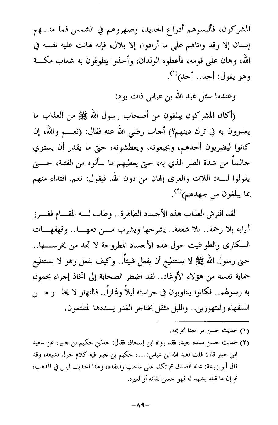 (أكان المشركون يبلغون من أصحاب رسول الله -صلى الله عليه وسلم- من العذاب ما يعذرون به في ترك دينهم؟) أجاب رضي الله عنه فقال: (نعم والله، إن كانوا ليضربون أحدهم، ويجيعونه، ويعطشونه، حتى ما يقدر أن يستوي جالسًا من شدة الضر الذي به، حتى يعطيهم ما سألوه من الفتنة، حتى يقولوا له: اللات والعزى إلهان من دون الله. فيقول: نعم. افتداء منهم بما يبلغون من جهدهم) (¬2).