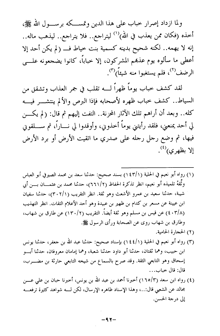 (¬3) رواه أبو نعيم في الحلية (1/ 144) بإسناد صحيح: حدثنا عبد الله بن جعفر، حدثنا يونس ابن حبيب، وهما ثقتان، حدثنا أبو داود حدثنا شعبقة، وهما إمامان معروفان، حدثنا أبو إسحاق وهو التابعي الثقة. وقد صرح بالسماع من شيخه التابعى حارثة بن مضرب، قال: قال خباب ...