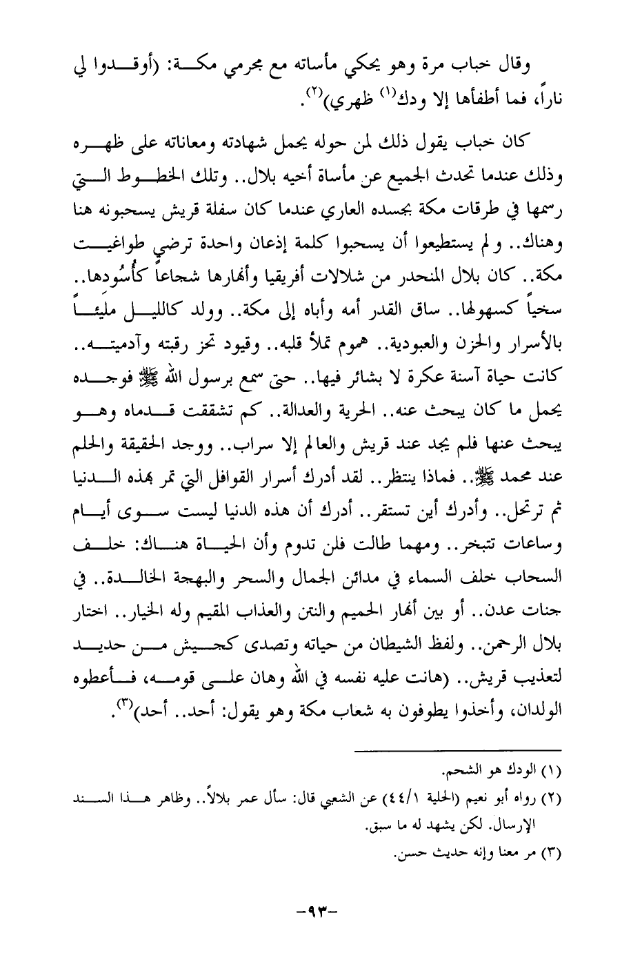كان خباب يقول ذلك لمن حوله يحمل شهادته ومعاناته على ظهره وذلك عندما تحدث الجميع عن مأساة أخيه بلال .. وتلك الخطوط التي رسمها في طرقات مكة بجسده العاري عندما كان سفلة قريش يسحبونه هنا وهناك .. ولم يستطيعوا أن يسحبوا كلمة إذعان واحدة ترضي طواغيت مكة .. كان بلال المنحدر من شلالات أفريقيا وأنهارها شجاعًا كأُسُودها .. سخيًا كسهولها .. ساق القدر أمه وأباه إلى مكة .. وولد كالليل مليئًا بالأسرار والحزن والعبودية .. هموم تملأ قلبه .. وقيود تحز رقبته وآدميته .. كانت حياة آسنة عكرة لا بشائر فيها .. حتى سمع برسول الله-صلى الله عليه وسلم- فوجده يحمل ما كان يبحث عنه .. الحرية والعدالة .. كم تشققت قدماه وهو يبحث عنها فلم يجد عند قريش والعالم إلا سراب .. ووجد الحقيقة والحلم عند محمَّد -صلى الله عليه وسلم- .. فماذا ينتظر .. لقد أدرك أسرار القوافل التي تمر بهذه الدنيا ثم ترتحل .. وأدرك أين تستقر .. أدرك أن هذه الدنيا ليست سوى أيام وساعات تتبخر .. ومهما طالت فلن تدوم وأن الحياة هناك: خلف السحاب خلف السماء في مدائن الجمال والسحر والبهجة الخالدة .. في جنات عدن .. أو بين أنهار الحميم والنتن والعذاب المقيم وله الخيار .. اختار بلال الرحمن .. ولفظ الشيطان من حياته وتصدى كجيش من حديد لتعذيب قريش .. (هانت عليه نفسه في الله وهان على قومه، فأعطوه الولدان، وأخذوا يطوفون به شعاب مكة وهو يقول: أحد .. أحد) (¬3).
