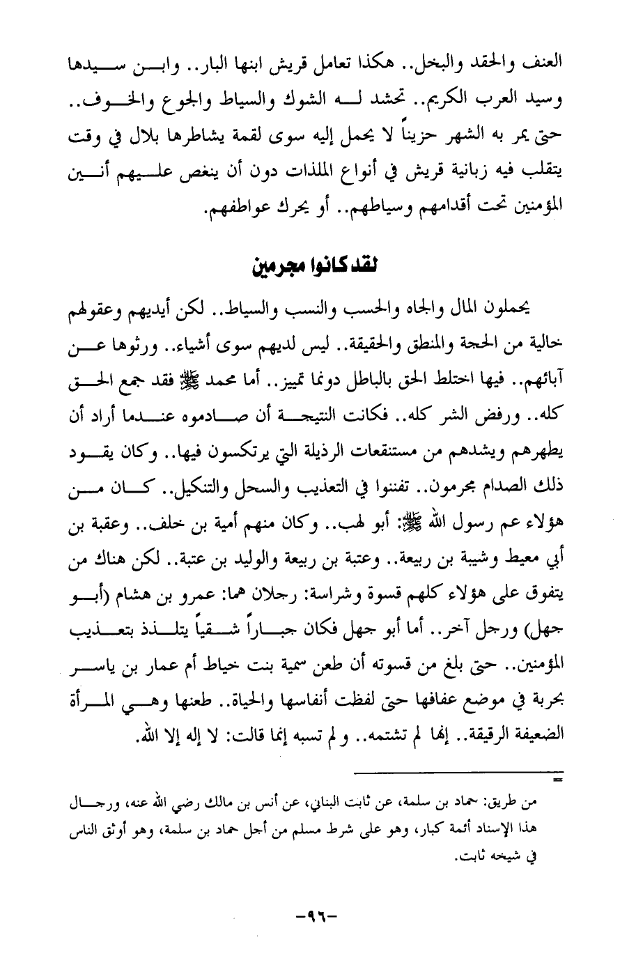 يحملون المال والجاه والحسب والنسب والسياط .. لكن أيديهم وعقولهم خالية من الحجة والمنطق والحقيقة .. ليس لديهم سوى أشياء .. ورثوها عن آبائهم .. فيها اختلط الحق بالباطل دونما تمييز .. أما محمد -صلى الله عليه وسلم-فقد جمع الحق كله .. ورفض الشر كله .. فكانت النتيجة أن صادموه عندما أراد أن يطهرهم ويشدهم من مستنقعات الرذيلة التي يرتكسون فيها .. وكان يقود ذلك الصدام مجرمون .. تفننوا في التعذيب والسحل والتنكيل .. كان من هؤلاء عم رسول الله -صلى الله عليه وسلم-: أبو لهب .. وكان منهم أمية بن خلف .. وعقبة بن أبي معيط وشيبة بن ربيعة .. وعتبة بن ربيعة والوليد بن عتبة .. لكن هناك من يتفوق على هؤلاء كلهم قسوة وشراسة: رجلان هما: عمرو بن هشام (أبو جهل) ورجل آخر .. أما أبو جهل فكان جبارًا شقيًا يتلذذ بتعذيب المؤمنين .. حتى بلغ من قسوته أن طعن سمية بنت خياط أم عمار بن ياسر بحربة في موضع عفافها حتى لفظت أنفاسها والحياة .. طعنها وهي المرأة الضعيفة الرقيقة .. إنها لم تشتمه .. ولم تسبه إنما قالت: لا إله إلا الله.