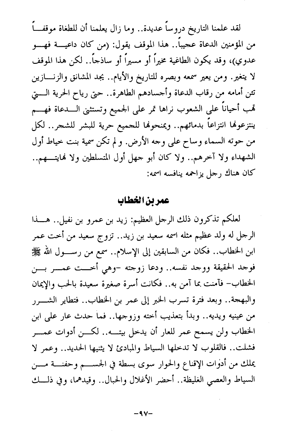 لعلكم تذكرون ذلك الرجل العظيم: زيد بن عمرو بن نفيل .. هذا الرجل له ولد عظيم مثله اسمه سعيد بن زيد .. تزوج سعيد من أخت عمر ابن الخطاب .. فكان من السابقين إلى الإسلام .. سمع من رسول الله -صلى الله عليه وسلم- فوجد الحقيقة ووجد نفسه .. ودعا زوجته -وهي أخت عمر بن الخطاب- فآمنت بما آمن به .. فكانت أسرة صغيرة سعيدة بالحب والإيمان والبهجة .. وبعد فترة تسرب الخبر إلى عمر بن الخطاب .. فتطاير الشرر من عينيه ويديه .. وبدأ بتعذيب أخته وزوجها .. فما حدث عار على ابن الخطاب ولن يسمح عمر للعار أن يدخل بيته .. لكن أدوات عمر فشلت .. فالقلوب لا تدخلها السياط والمبادئ لا يثنيها الحديد .. وعمر لا يملك من أدوات الإقناع والحوار سوى بسطة في الجسم وحفنة من السياط والعصي الغليظة .. أحضر الأغلال والحبال .. وقيدهما، وفي ذلك