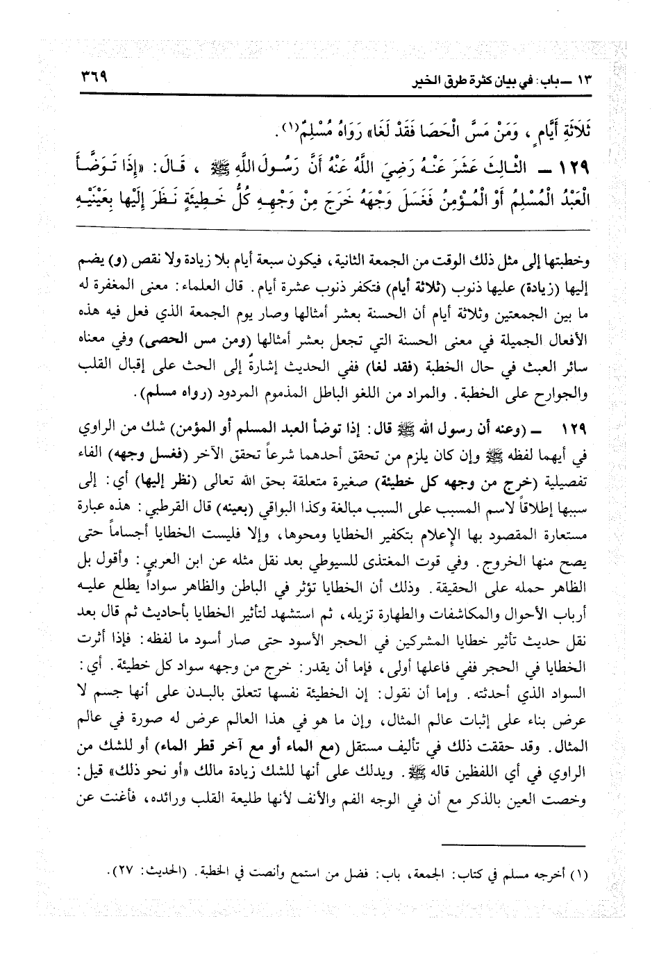 129 - (الثالث عشر: عنه أن رسول قال: إذا توضأ العبد المسلم أو المؤمن) شك من الراوي في أيهما لفظه وإن كان يلزم من تحقق أحدهما شرعاً تحقق الآخر (فغسل وجهه) الفاء تفصيلية (خرج من وجهه كل خطيئة) صغيرة متعلقة بحق الله تعالى (نظر إليها) أي: إلى سببها إطلاقاً لاسم المسبب على السبب مبالغة وكذا البواقي (بعينه) قال القرطبي: هذه عبارة مستعارة المقصود بها الإعلام بتكفير الخطايا ومحوها، وإلا فليست الخطايا أجساماً حتى يصح منها الخروج. وفي «قوت المغتذي» للسيوطي بعد نقل مثله عن ابن العربي: وأقول بل الظاهر حمله على الحقيقة وذلك أن الخطايا تؤثر في الباطن والظاهر سواداً يطلع عليه أرباب الأحوال والمكاشفات والطهارة تزيله، ثم استشهد لتأثير الخطايا بأحاديث ثم قال بعد نقل حديث تأثير خطايا المشركين في الحجر الأسود حتى صار أسود ما لفظه: فإذا أثرت الخطايا في الحجر ففي فاعلها أولى؛ فإما أن يقدر خرج من وجهه سواد كل خطيئة: أي: السواد الذي أحدثته، وإما أن نقول إن الخطيئة نفسها تتعلق بالبدن على أنها جسم لا عرض بناء على إثبات عالم المثال، وأن ما هو في هذا العالم عرض له صورة في عالم المثال، وقد حققت ذلك في تأليف مستقل (مع الماء أو مع آخر قطر الماء) أو للشك من الراوي في أي اللفظين قاله، ويدلك على أنها للشك زيادة مالك «أو نحو ذلك» قيل: وخصت العين بالذكر مع أن في الوجه الفم والأنف لأنها طليعة القلب ورائده فأغنت عن
