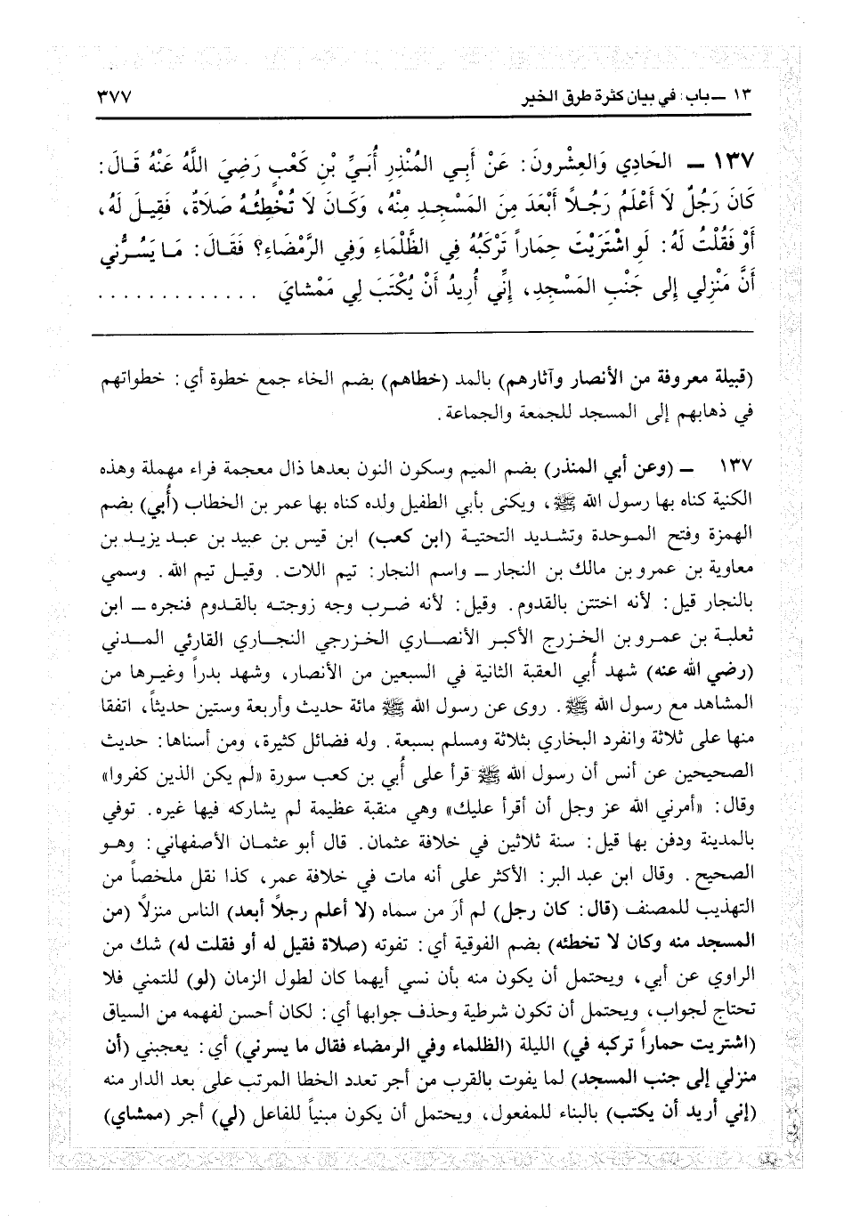 137 - (الحادي والعشرون: عن أبي المنذر) بضم الميم وسكون النون بعدها ذال معجمة فراء مهملة، وهذه الكنية كناه بها رسول الله، ويكنى بأبي الطفيل ولده، كناه بها عمربن الخطاب (أبيّ) بضم الهمزة وفتح الموحدة وتشديد التحتية (ابن كعب) بن قيس ابن عبيدبن عبد يزيدبن معاويةبن عمروبن مالكبن النجار. واسم النجار تيم اللات، وقيل: تيمالله، وسمي بالنجار قيل لأنه اختّن بالقدوم، وقيل: لأنه ضرب وجه زوجته بالقدوم فنجره، ابن ثعلبةبن عمروبن الخزرج الأكبر الأنصاري الخزجي النجاري القارئي المدني (رضي الله عنه) شهد أبيّ العقبة الثانية في السبعين من الأنصار، وشهد بدراً وغيرها من المشاهد مع رسول الله. روى عن رسول الله - صلى الله عليه وسلم - مائة حديث وأربعة وستين حديثاً، اتفقا منها على ثلاثة، وانفرد البخاري بثلاثة، ومسلم بسبعة، وله فضائل كثيرة. ومن أسناها حديث الصحيحين عن أنس «أن رسول الله - صلى الله عليه وسلم - قرأ على أبيّبن كعب سورة {لم يكن الذين كفروا} (البينة: 1) وقال: أمرني الله عزّ وجل أن أقرأ عليك» وهي منقبة عظيمة لم يشاركه فيها غيره. توفي بالمدينة ودفن بها، قيل: سنة ثلاثين في خلافة عثمان، قال أبو عثمان الأصفهاني: وهو الصحيح. وقال ابن عبد البرّ: الأكثر على أنه مات في خلافة عمر، كذا نقل ملخصاً من «التهذيب للمصنف» (قال: كان رجل) لم أر من سماه (لا أعلم رجلاً أبعد) الناس منزلاً (من المسجد منه، وكان لا تخطئه) بضم الفوقية: أي: تفوته (صلاة، فقيل له. أو فقلت له) شك من الراوي عن أبيّ، ويحتمل أن يكون منه بأن نسي أيهما كان لطول الزمان (لو) للتمني فلا تحتاج لجواب، ويحتمل أن تكون شرطية وحذف جوابها: أي: لكان أحسن لفهمه من السياق (اشتريت حماراً تركبه في) الليلة (الظلماء وفي الرمضاء فقال ما يسرني) أي: يعجبني (أن منزلي إلى جنب المسجد) لما يفوت بالقرب من أجر تعدد الخطا المرتب على بعد الدار منه (إني أريد أن يكتب) بالبناء