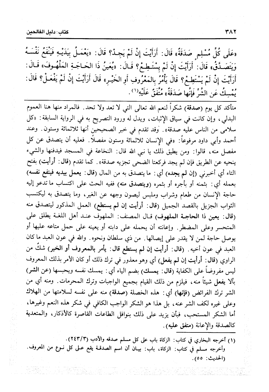 متأكد كل يوم (صدقة) شكراً لنعم الله تعالى التي لا تعد ولا تحد، فالمراد منها هنا العموم البدلي وإن كانت في سياق الإثبات، ويدل له ورود التصريح به في الرواية السابقة «كل سلامى من الناس عليه صدقة» وقد تقدم في خبر «الصحيحين» أنها ثلاثمائة وستون. وعند أحمد وأبي داود مرفوعاً «في الإنسان ثلاثمائة وستون مفصلاً، فعليه أن يتصدق عن كل مفصل منه، قالوا: ومن يطيق ذلك يا نبي ا؟ قال: النخاعة في المسجد فيدفنها، والشيء ينحيه عن الطريق، فإن لم يجد فركعتا الضحى تجزيه صدقة» كما تقدم (قال أرأيت) بفتح التاء: أي: أخبرني (إن لم يجده) أي: ما يتصدق به من المال (قال: يعمل بيديه فينفع نفسه) بعمله: أي: بثمنه أو بأجره أو بثمره (ويتصدق) منه، ففيه الحثّ على اكتساب ما تدعو إليه حاجة الإنسان من طعام وشراب وملبس ليصون وجهه عن الغير وما يتصدق به ليكتسب الثواب الجزيل بالقصد الجميل (قال: أرأيت إن لم يستطع) العمل المذكور ليتصدق منه (قال: يعين ذا الحاجة الملهوف) قال المصنف: الملهوف عند أهل اللغة يطلق على المتحسر وعلى المضطر، وإعانته أن يحمله على دابته أو يعينه على حمل متاعه عليها أو يوصل حاجة لمن لا يقدر على إيصالها من ذي سلطان ونحوه «وا في عون العبد ما كان العبد في عون أخيه» (قال: أرأيت إن لم يستطع؟ قال: يأمر بالمعروف أو الخير) شك من الراوي (قال: أرأيت إن لم يفعل) أي: وهو معذور في ترك ذلك أو كان الأمر بذلك المعروف ليس مفروضاً على الكفاية (قال: يمسك) بضم الياء: أي: يمسك نفسه ويحبسها (عن الشر) بألا يفعل شيئاً منه فيلزم من ذلك القيام بجميع الواجبات وترك المحرمات، ومنه: أي: من الشرّ ترك الفرائض (فإنها) أي: هذه الخصلة (صدقة) منه على نفسه لسلامتها من الهلاك، وعلى غيره لكف الشرّ عنه، بل هذا هو الشكر الواجب الكافي في شكر هذه النعم