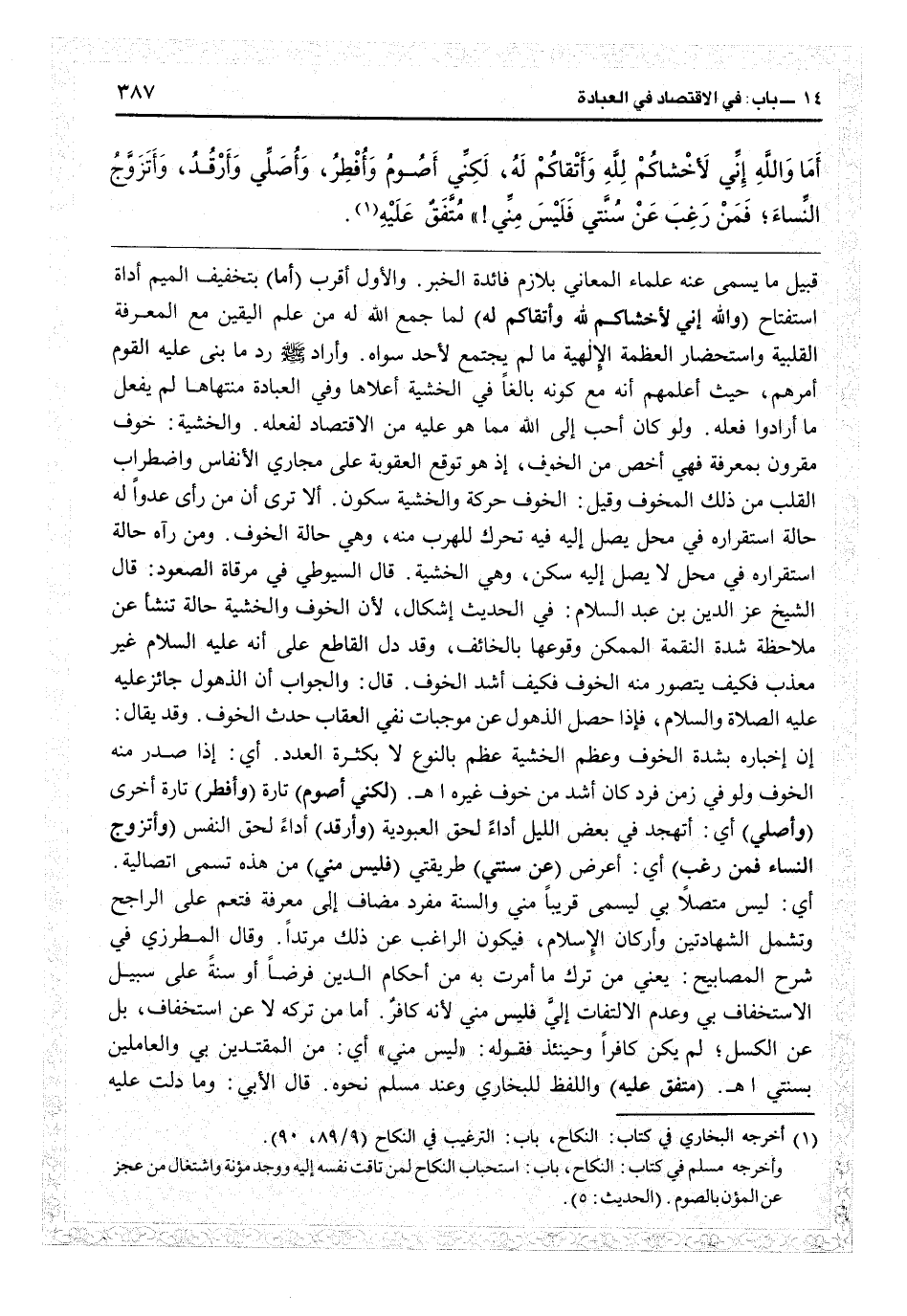 قبيل ما يسمى عند علماء المعاني بلازم فائدة الخبر والأول أقرب (أما) بتخفيف الميم أداة استفتاح (وا إني لأخشاكم وأتقاكم له) لما جمع الله له من علم اليقين مع المعرفة القلبية واستحضار العظمة الإلهية ما لم يجتمع لأحد سواه وأراد ردّ ما بنى عليه القوم أمرهم حيث أعلمهم أنه مع كونه بالغاً في الخشية أعلاها وفي العبادة منتهاها لم يفعل ما أرادوا فعله. ولو كان أحب إلى الله مما هو عليه من الاقتصاد لفعله. والخشية: خوف مقرون بمعرفة فهي أخص من الخوف إذ هو توقع العقوبة على مجاري الأنفاس واضطراب القلب من ذلك المخوف. وقيل: الخوف حركة والخشية سكون، ألا ترى أن من رأى عدوّاً له حالة استقراره في محل يصل إليه فيه تحرّك للهرب منه وهي حالة الخوف، ومن رآه حالة استقراره في محل لا يصل إليه سكن وهي الخشية. قال السيوطي في «مرقاة الصعود» : قال الشيخ عز الدينبن عبد السلام: في الحديث إشكال لأن الخوف والخشية حالة تنشأ عن ملاحظة شدة النقمة الممكن وقوعها بالخائف، وقد دل القاطع على أنه عليه الصلاة والسلام غير معذب فكيف يتصوّر منه الخوف، فكيف أشد الخوف؟ قال: والجواب أن الذهول جائز عليه، عليه الصلاة والسلام، فإذا حصل الذهول عن موجبات نفي العقاب حدث الخوف. وقد يقال: إن إخباره بشدة الخوف وعظم الخشية عظم بالنوع لا بكثرة العدد: أي: إذا صدر منه الخوف ولو في زمن فرد كان أشد من خوف غيره اهـ (لكني أصوم) تارة (وأفطر) تارة أخرى (وأصلي) أي: أتهجد في بعض الليل. أداء لحق العبودية (وأرقد) أداء لحق النفس (وأتزوّج النساء، فمن رغب) أي: أعرض (عن سنتي) طريقتي (فليس مني) من هذه، تسمى اتصالية: أي: ليس متصلاً بي ليسمى قريباً مني، والسنة مفرد مضاف إلى معرفة فتعم على الراجح وتشمل الشهادتين وأركان