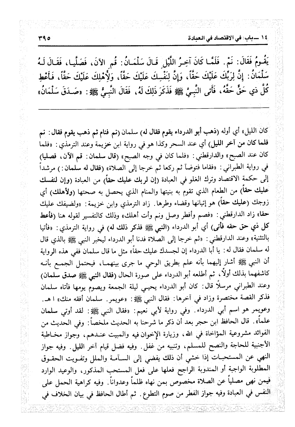 قال الحافظ ابن حجر بعد أن ذكر ما شرحنا به الحديث ملخصاً: وفي الحديث من الفوائد مشروعية المؤاخاة فيالله، وزيارة الإخوان فيه والمبيت عندهم، وجواز مخاطبة الأجنبية للحاجة، والنصح للمسلم وتنبيه من غفل، وفيه فضل قيام آخر الليل، وفيه جواز النهي عن المستحبات إذا خشي أن ذلك يفضي إلى السآمة والملل وتفويت الحقوق المطلوبة الواجبة أو المندوبة الراجح فعلها على فعل المستحب المذكور. والوعيد الوارد فيمن نهى مصلياً عن الصلاة مخصوص بمن نهاه ظلماً وعدواناً، وفيه كراهية الحمل على النفس في العبادة، وفيه جواز الفطر من صوم التطوع. ثم أطال الحافظ في بيان الخلاف في