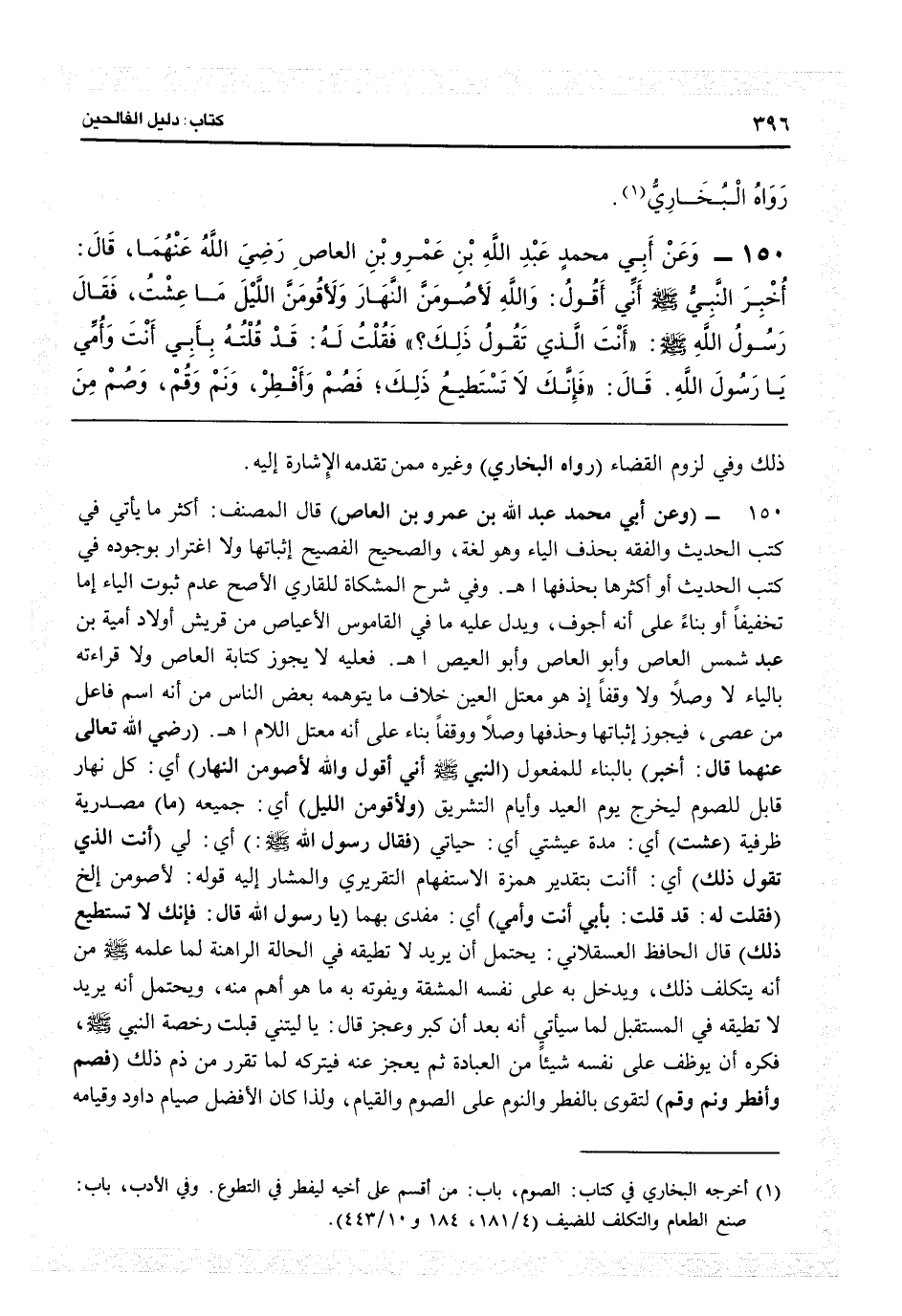 1509 - (وعن أبي محمد عبد ابن عمروبن العاص) قال المصنف: أكثر ما يأتي في كتب الحديث والفقه بحذف الياء وهو لغة، والصحيح الفصيح إثباتها، ولا اغترار بوجوده في كتب الحديث أو أكثرها بحذفها اهـ. وفي «شرح المشكاة للقاري» : الأصح عدم ثبوت الياء إما تخفيفاً أو بناء على أنه أجوف ويدل عليه ما في «القاموس» : الأعياص من قريش أولاد أمية بن عبد شمس: العاص وأبو العاص وأبو العيص اهـ. فعليه لا يجوز كتابة العاص ولا قراءته بالياء لا وصلاً ولا وقفاً، إذ هو معتل العين خلاف ما يتوهمه بعض الناس من أنه اسم فاعل من عصى فيجوز إثباتها وحذفها وصلاً ووقفاء بناء على أنه معتل اللام اهـ (رضي الله تعالى عنهما قال: أخبر) بالبناء للمفعول (النبي إني أقول: وا لأصومنّ النهار) أي: كل نهار قابل للصوم ليخرج يوم العيد وأيام التشريق (ولأقومنّ الليل) أي: جميعه (ما) مصدرية ظرفية (عشت) أي: مدة عيشتي: أي حياتي (فقال رسول الله) أي: لي (أنت الذي تقول ذلك؟) أي: أأنت بتقدير همزة الاستفهام التقريري والمشار إليه قوله لأصومن الخ (فقلت له: قد قلته بأبي أنت وأمي) أي: مفدي بهما (يا رسول الله: قال: فإنك لا تستطيع ذلك) .