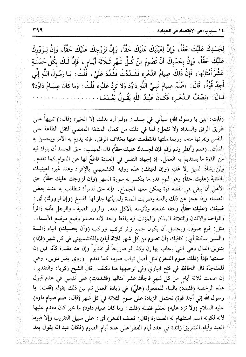 (قلت: بلى يا رسول الله) سيأتي في مسلم: ولم أرد بذلك إلى الخير (قال) تنبيهاً على طريق الرفق والسداد (لا تفعل لما في ذلك من كمال المشقة المفضي بثقل الطاعة على النفس ونفرتها منه وربما ملتها فانقطعت عنها بخلاف الرفق فإنه يدوم به الأمر، ويحسن به الشأن (صم وأفطر ونم وقم، فإن لجسدك عليك حقا) قال المهلب: حق الجسد أن يترك فيه من القوة ما يستديم به العمل إذ إجهاد النفس في العبادة قاطع لها عن الدوام كما تقدم «ولن يشادّ الدين إلا غلبه» (وإن لعينك) هذه رواية الكشميهني بالإفراد وعند غيره لعينيك بالتثنية (عليك حقاً) وهو النوم قدر ما ينكسر به سورة السهر (وإن لزوجك عليك حقاً) حق الأهل أن يبقى في نفسه قوّة يمكن معها الجماع، فإنه حق للمرأة تطالب به عند بعض العلماء، وإذا عجز عن ذلك بالعنة وضربت المدة ولم يأتها جاز لها الفسخ (وإن لزورك) أي: ضيفك (عليك حقاً) وحقه خدمته وتأنيسه بالأكل معه، والزور الضيف والرجل يأتيه زائراً والواحد والإنثان والثلاثة، المذكر والمؤنث فيه بلفظ واحد لأنه مصدر وضع موضع الأسماء مثل قوم صوم، ويحتمل أن يكون جمع زائر كركب وراكب (وإن بحسبك) الباء زائدة والسين ساكنة أي كافيك (أن تصوم من كل شهر ثلاثة أيام) وللكشميهني في كل شهر (فإذا) بتنوين الذال وهي التي يجاب بها وإن وكذا لو صريحاً أو تقديراً وإن هنا مقدرة كأنه قيل إن صمتها فإذاً (ذلك صوم الدهر) مثل أصل ثواب صومه كما تقدم وروي بغير تنوين وهي للمفاجأة.