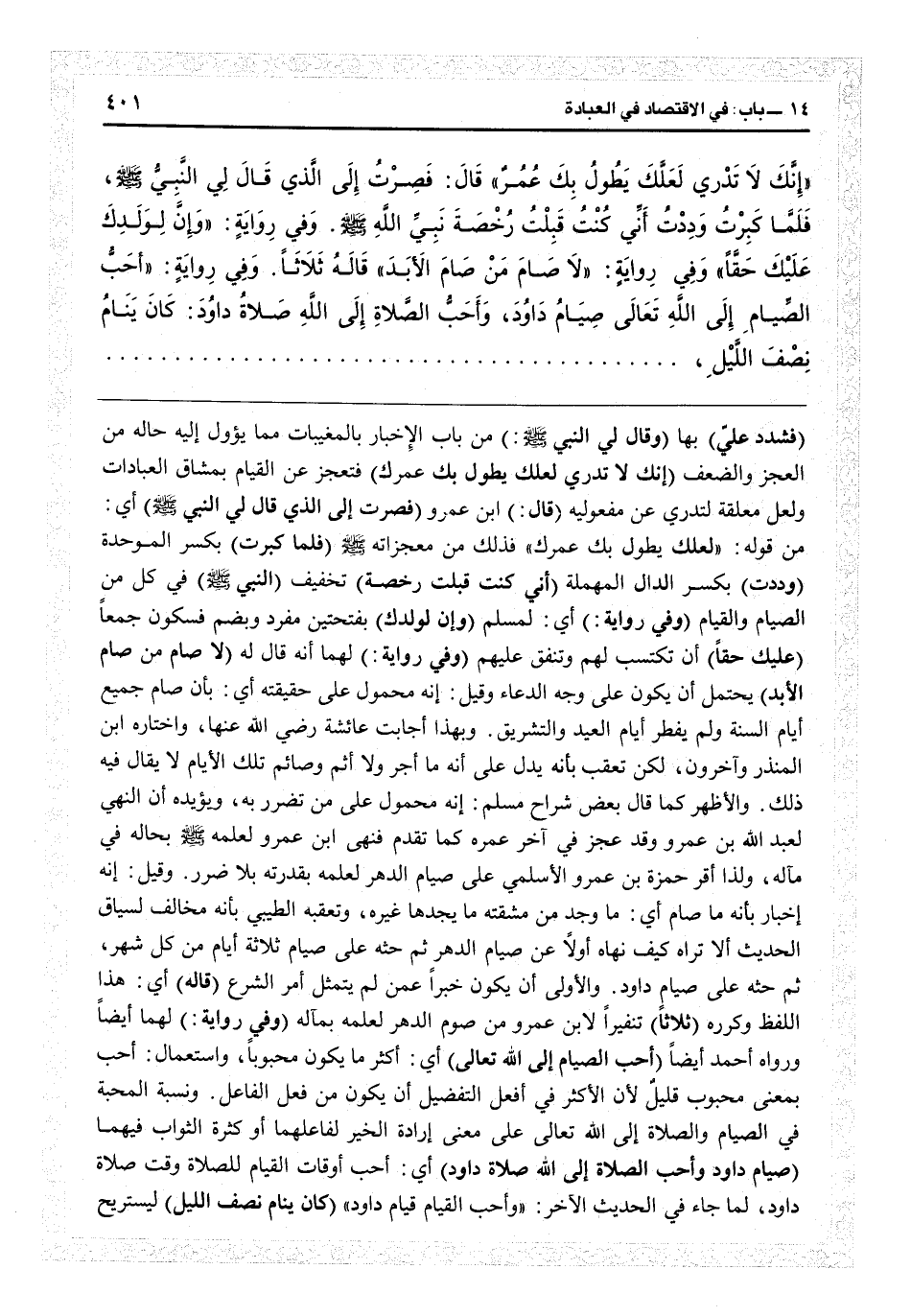 (فشدد عليّ) بها (وقال لي النبي) من باب الإخبار بالمغيبات مما يئول إليه حاله من العجز والضعف (إنك لا تدري لعلك يطول بك عمرك) فتعجز عن القيام بمشاق العبادات ولعل معلقة لتدري عن مفعوليه (قال) ابن عمرو (فصرت إلى الذي قال لي النبيّ)