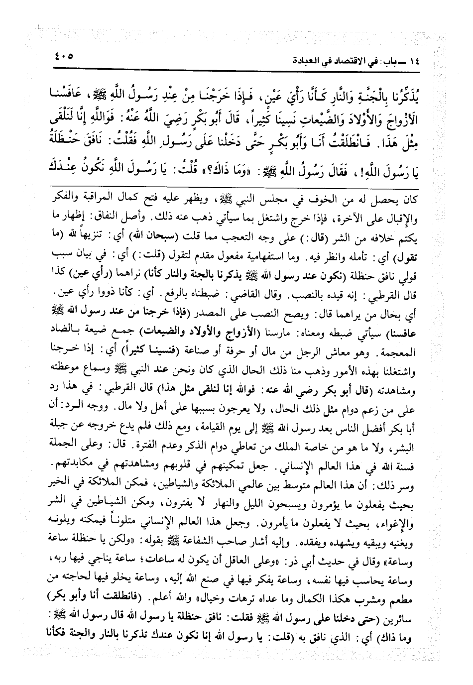 قال القرطبي: في هذا رد على من زعم دوام مثل ذلك الحال ولا يعرجون بسببها على أهل ولا مال. ووجه الردّ أن أبا بكر أفضل الناس بعد رسول الله - صلى الله عليه وسلم - إلى يوم القيامة، ومع ذلك فلم يدع خروجه عن جبلة البشر، ولا ما هو من خاصة الملك من تعاطى دوام الذكر وعدم الفترة. قال: وعلى الجملة فسنة الله في هذا العالم الإنسان جعل تمكينهم في قلوبهم ومشاهدتهم في مكابدتهم. وسرّ ذلك أن هذا العالم متوسط بين عالمي الملائكة والشياطين، فمكن الملائكة في الخير بحيث يفعلون ما يؤمرون و «يسبحون الليل والنهار لا يفترون» ، ومكن الشياطين في الشر والإغواء بحيث لا يفعلون ما يؤمرون، وجعل هذا العالم الإنساني متلوّناً فيمكنه ويلونه ويغنيه ويبقيه ويشهده ويفقده وإليه أشار صاحب الشفاعة بقوله: «ولكن يا حنظلة ساعة وساعة» وقال في حديث أبي ذرّ «وعلى العاقل أن يكون له ساعات: ساعة يناجي فيها ربه، وساعة يحاسب فيها نفسه، وساعة يفكر فيها في صنع الله إليه، وساعة يخلو فيها لحاجته من مطعم ومشرب» هكذا الكمال وما عداه ترّهات وخيال. والله أعلم (فانطلقت أنا وأبو بكر) سائرين (حتى دخلنا على رسول الله؛ فقلت: نافق حنظلة يا رسولالله، فقال: وما ذاك؟) أي: الذي نافق به. (قلت: يا رسول الله إنا نكون عندك تذكرنا بالنار والجنة فكأنا