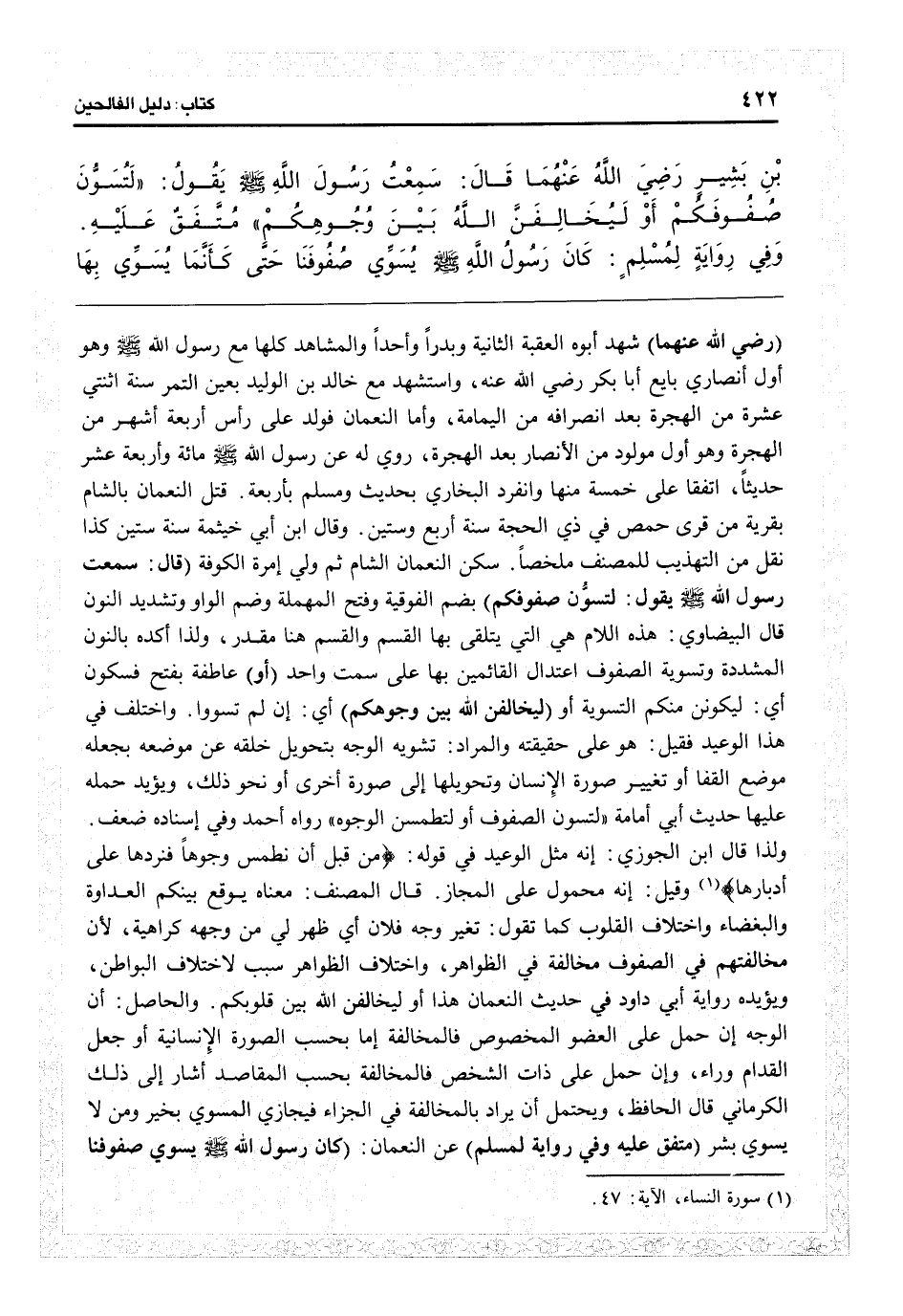 رضي الله عنهما شهد أبوه العقبة الثانية وبدراً وأحداً والمشاهد كلها مع رسول الله. وهو أول أنصاري بايع أبا بكر رضي الله عنه، واستشهد مع خالدبن الوليد بعين التمر سنة اثنتي عشرة من الهجرة بعد انصرافه من اليمامة. وأما النعمان فولد على رأس أربعة أشهر من الهجرة، وهو أول مولود من الأنصار بعد الهجرة. روي له عن رسول الله - صلى الله عليه وسلم - مائة وأربعة عشر حديثاً، اتفقا على خمسة منها، وانفرد البخاري بحديث ومسلم بأربعة قتل النعمان بالشام بقرية من قرى حمص في ذي الحجة سنة أربع وستين. وقال ابن أبي خيثمة سنة ستين، كذا نقل من «التهذيب» للمصنف ملخصاً، سكن النعمان الشام ثم ولي أمره الكوفة (قال: سمعت رسول الله - صلى الله عليه وسلم - يقول: لتسوُّن صفوفكم) بضم الفوقية وفتح المهملة وضم الواو وتشديد النون، قال البيضاوي: هذه اللام هي التي يتلقى بها القسم، والقسم هنا مقدر ولذا أكده بالنون المشددة وتسوية الصفوف اعتدال القائمين بها على سمت واحد (أو) عاطفة بفتح فسكون: أي: ليكونن منكم التسوية أو (ليخالفنّ الله بين وجوهكم) أي: إن لم تسووا. واختلف في هذا الوعيد، فقيل هو على حقيقته، والمراد تشويه الوجه بتحويل خلقه عن موضعه بجعله موضع القفا، أو تغيير صورة الإنسان وتحويلها إلى صورة أخرى أو نحو ذلك، ويؤيد حمله عليها حديث أبي أمامة «لتسونّ الصفوف أو لتطمسنّ الوجوه» رواه أحمد وفي إسناده ضعف، ولذا قال ابن الجوزي: إنه مثل الوعيد في قوله: {من قبل أن نطمس وجوها فنردها على أدبارها} (النساء: 47) وقيل: إنه