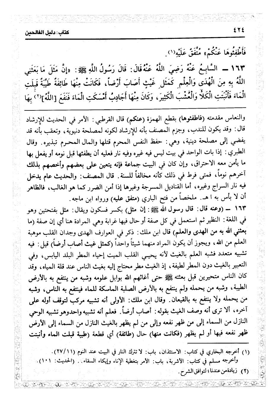 162 - (السابع: عنه قال: قال رسول الله: إن مثل) بكسر فسكون ويقال مثل بفتحتين، وهو في اللغة النظير ثم استعمل في كل صفة أو حال فيها غرابة وهي المراد هنا أي إن صفة (ما بعثني الله به من الهدى والعلم) قال ابن ملك: ذكر في العوارف الهدى وجدان القلب موهبة العلم من الله ويجوز أن يكون المراد منهما شيئاً واحداً (كمثل غيث أصاب أرضاً) قيل: فيه تشبيه متعدد، فشبه العلم بالغيث لأنه يحيى القلب الميت إحياء المطر البلد اليابس، وفي التعبير بالغيث دون المطر لطيفة، إذ الغيث مطر محتاج إليه يغيث الناس عند قلة المياه، وقد كان الناس متحيرين قبل بعثته حتى أغاثهم الله بوابل علومه؛ وشبه من ينتفع به بالأرض الطيبة، وشبه من يحمله ولم ينتفع به بالأرض الصلبة الماسكة للماء فينتفع به الناس وشبه من يحمله ولا ينتفع به بالقيعان. وقال ابن ملك: الأولى أنه تشبيه مركب لتوقف أوله على آخره، ألا ترى أنه وصف الغيث بقوله: «أصاب أرضاً» فعلم أنه تشبيه واحد وهو تشبيه الوحي النازل من السماء إلى من ظهر نفعه، وإلى من لم يظهر بالغيث النازل من السماء إلى الأرض ظهر نفعه فيها أو لم يظهر (فكانت منها) حال (طائفة) أي: قطعة (طيبة قبلت الماء وأنبتت