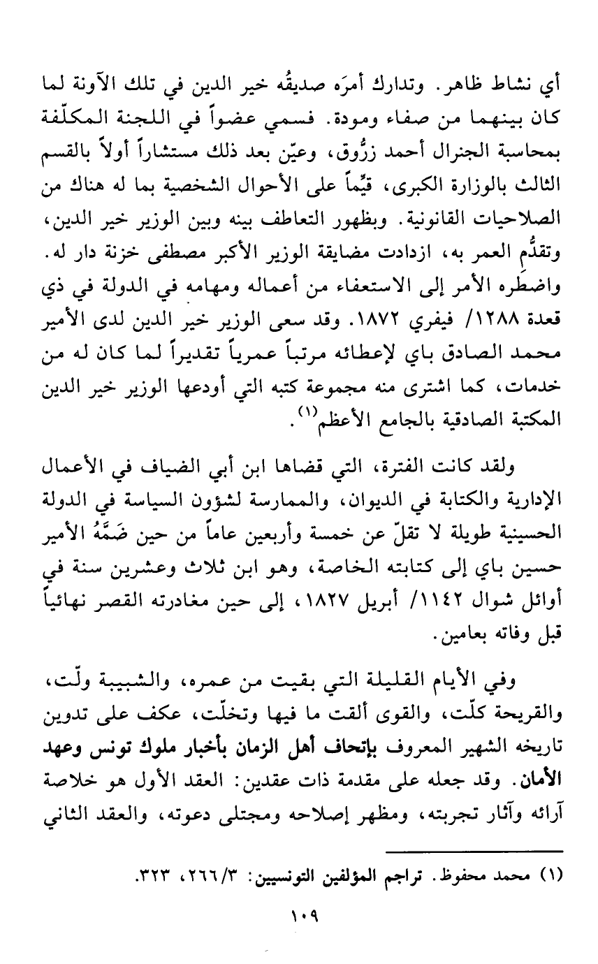 أي نشاط ظاهر. وتدارك أمرَه صديقُه خير الدين في تلك الآونة لما كان بينهما من صفاء ومودة. فسمي عضواً في اللجنة المكلّفة بمحاسبة الجنرال أحمد زرُّوق، وعيّن بعد ذلك مستشاراً أولاً بالقسم الثالث بالوزارة الكبرى، قيِّماً على الأحوال الشخصية بما له هناك من الصلاحيات القانونية. وبظهور التعاطف بينه وبين الوزير خير الدين، وتقدُّم العمر به، ازدادت مضايقة الوزير الأكبر مصطفى خزنة دار له. واضطَره الأمر إلى الاستعفاء من أعماله ومهامه في الدولة في ذي قعدة 1288/ فيفري 1872. وقد سعى الوزير خير الدين لدى الأمير محمد الصادق باي لإعطائه مرتباً عمرياً تقديراً لما كان له من خدمات، كما اشترى منه مجموعة كتبه التي أودعها الوزير خير الدين المكتبة الصادقية بالجامع الأعظم (¬1).