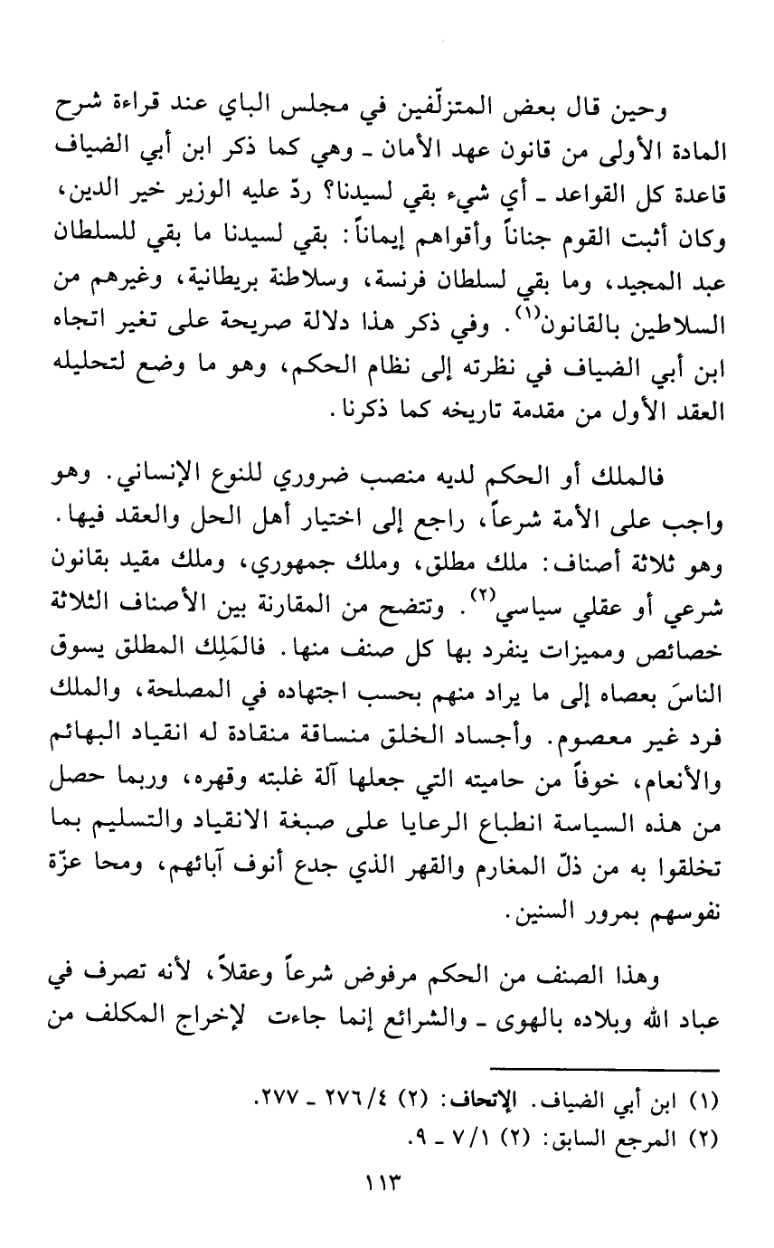 وحين قال بعض المتزلّفين في مجلس الباي عند قراءة شرح المادة الأولى من قانون عهد الأمان - وهي كما ذكر ابن أبي الضياف قاعدة كل القواعد - أي شيء بقي لسيدنا؟ ردّ عليه الوزير خير الدين، وكان أثبت القوم جناناً وأقواهم إيماناً: بقي لسيدنا ما بقي للسلطان عبد المجيد، وما بقي لسلطان فرنسة، وسلاطنة بريطانية، وغيرهم من السلاطين بالقانون (¬1). وفي ذكر هذا دلالة صريحة على تغير اتجاه ابن أبي الضياف في نظرته إلى نظام الحكم، وهو ما وضع لتحليله العقد الأول من مقدمة تاريخه كما ذكرنا.