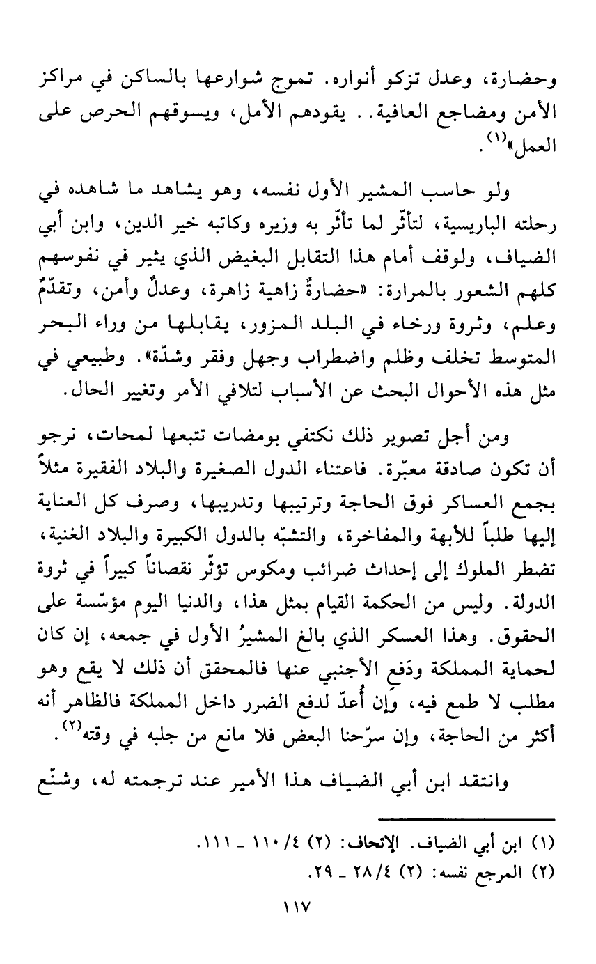 ومن أجل تصوير ذلك نكتفي بومضات تتبعها لمحات، نرجو أن تكون صادقة معبّرة. فاعتناء الدول الصغيرة والبلاد الفقيرة مثلاً بجمع العساكر فوق الحاجة وترتيبها وتدريبها، وصرف كل العناية إليها طلباً للأبهة والمفاخرة، والتشبّه بالدول الكبيرة والبلاد الغنية، تضطر الملوك إلى إحداث ضرائب ومكوس تؤثّر نقصاناً كبيراً في ثروة الدولة. وليس من الحكمة القيام بمثل هذا، والدنيا اليوم مؤسّسة على الحقوق. وهذا العسكر الذي بالغ المشيرُ الأول في جمعه، إن كان لحماية المملكة ودَفعِ الأجنبي عنها فالمحقق أن ذلك لا يقع وهو مطلب لا طمع فيه، وإن أُعدّ لدفع الضرر داخل المملكة فالظاهر أنه أكثر من الحاجة، وإن سرّحنا البعض فلا مانع من جلبه في وقته (¬2).