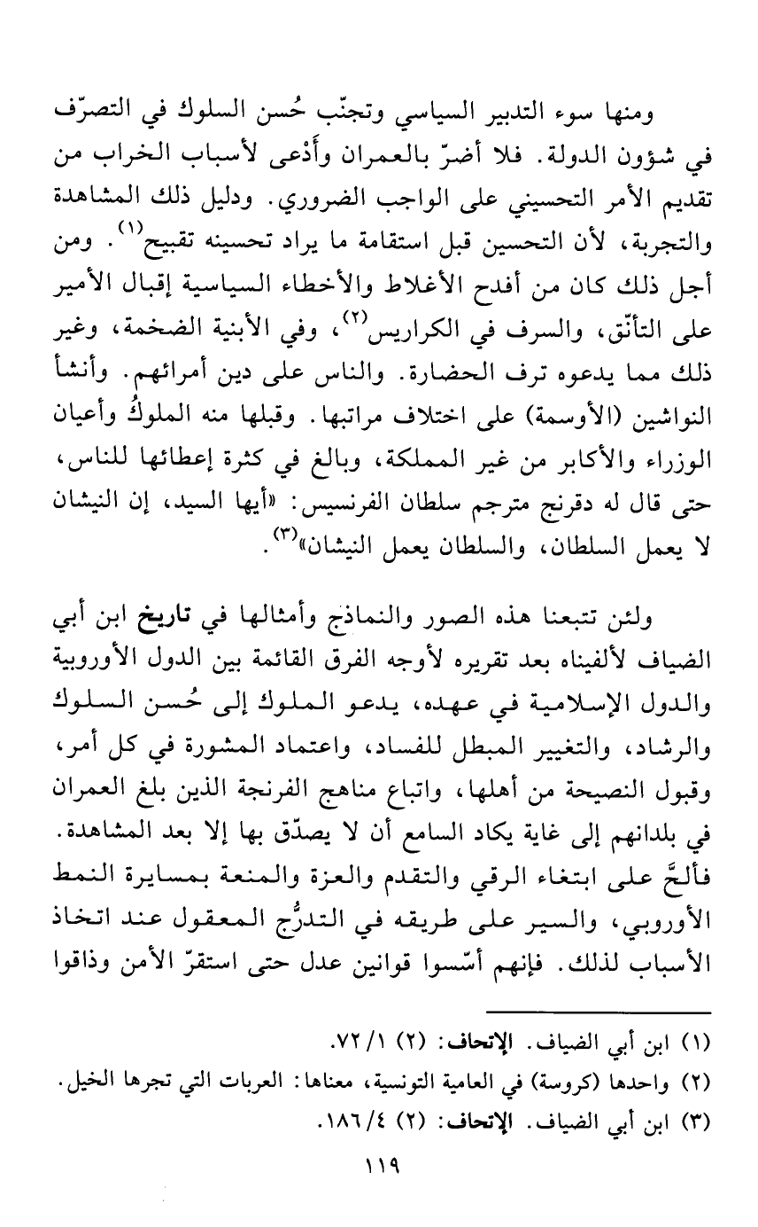 ولئن تتبعنا هذه الصور والنماذج وأمثالها في تاريخ ابن أبي الضياف لألفيناه بعد تقريره لأوجه الفرق القائمة بين الدول الأوروبية والدول الإسلامية في عهده، يدعو الملوك إلى حُسن السلوك والرشاد، والتغيير المبطل للفساد، واعتماد المشورة في كل أمر، وقبول النصيحة من أهلها، واتباع مناهج الفرنجة الذين بلغ العمران في بلدانهم إلى غاية يكاد السامع أن لا يصدّق بها إلا بعد المشاهدة. فألحَّ على ابتغاء الرقي والتقدم والعزة والمنعة بمسايرة النمط الأوروبي، والسير على طريقه في التدرُّج المعقول عند اتخاذ الأسباب لذلك. فإنهم أسّسوا قوانين عدل حتى استقرّ الأمن وذاقوا