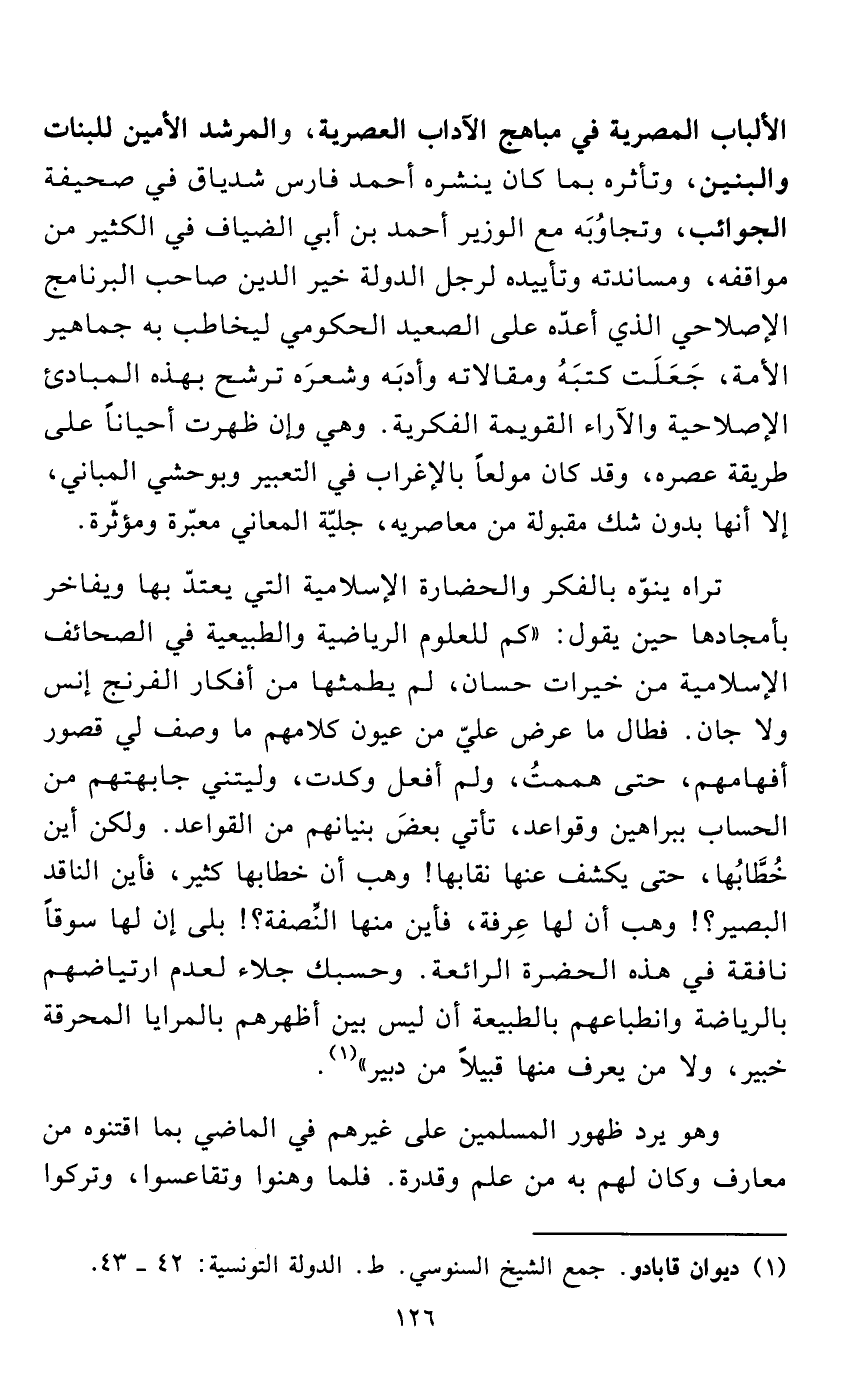 تراه ينوّه بالفكر والحضارة الإسلامية التي يعتدّ بها ويفاخر بأمجادها حين يقول: "كم للعلوم الرياضية والطبيعية في الصحائف الإسلامية من خيرات حسان، لم يطمثها من أفكار الفرنج إنس ولا جان. فطال ما عرض عليّ من عيون كلامهم ما وصف لي قصور أفهامهم، حتى هممتُ، ولم أفعل وكدت، وليتني جابهتهم من الحساب ببراهين وقواعد، تأتي بعضَ بنيانهم من القواعد. ولكن أين خُطَّابُها، حتى يكشف عنها نقابها! وهب أن خطابها كثير، فأين الناقد البصير؟! وهب أن لها عِرفة، فأين منها النِّصفة؟! بلى إن لها سوقاً نافقة في هذه الحضرة الرائعة. وحسبك جلاء لعدم ارتياضهم بالرياضة وانطباعهم بالطبيعة أن ليس بين أظهرهم بالمرايا المحرقة خبير، ولا من يعرف منها قبيلاً من دبير" (¬1).