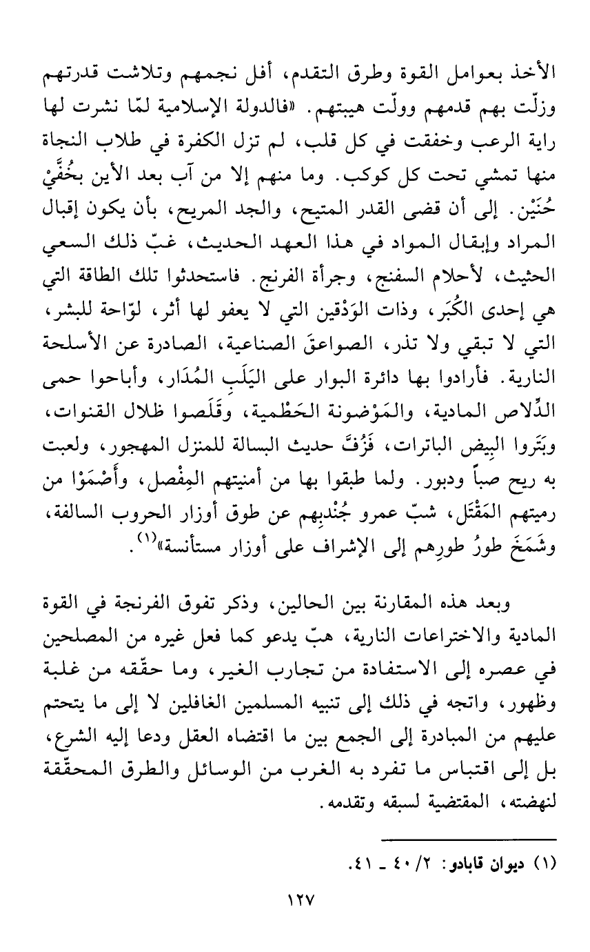 الأخذ بعوامل القوة وطرق التقدم، أفل نجمهم وتلاشت قدرتهم وزلّت بهم قدمهم وولّت هيبتهم. "فالدولة الإسلامية لمّا نشرت لها راية الرعب وخفقت في كل قلب، لم تزل الكفرة في طلاب النجاة منها تمشي تحت كل كوكب. وما منهم إلا من آب بعد الأين بخُفَّيْ حُنَيْن. إلى أن قضى القدر المتيح، والجد المريح، بأن يكون إقبال المراد وإبقال المواد في هذا العهد الحديث، غبّ ذلك السعي الحثيث، لأحلام السفنج، وجرأة الفرنج. فاستحدثوا تلك الطاقة التي هي إحدى الكُبَر، وذات الوَدْقين التي لا يعفو لها أثر، لوّاحة للبشر، التي لا تبقي ولا تذر، الصواعقَ الصناعية، الصادرة عن الأسلحة النارية. فأرادوا بها دائرة البوار على اليَلَب المُدَار، وأباحوا حمى الدِّلاص المادية، والمَوْضونة الحَطْمية، وَقَلَصوا ظلال القنوات، وبَتَروا البِيض الباترات، فَزُفَّ حديث البسالة للمنزل المهجور، ولعبت به ريح صباً ودبور. ولما طبقوا بها من أمنيتهم المِفْصل، وأَصْمَوْا من رميتهم المَقْتَل، شبّ عمرو جُنْدبِهم عن طوق أوزار الحروب السالفة، وشَمَخَ طورُ طورِهم إلى الإشراف على أوزار مستأنسة" (¬1).