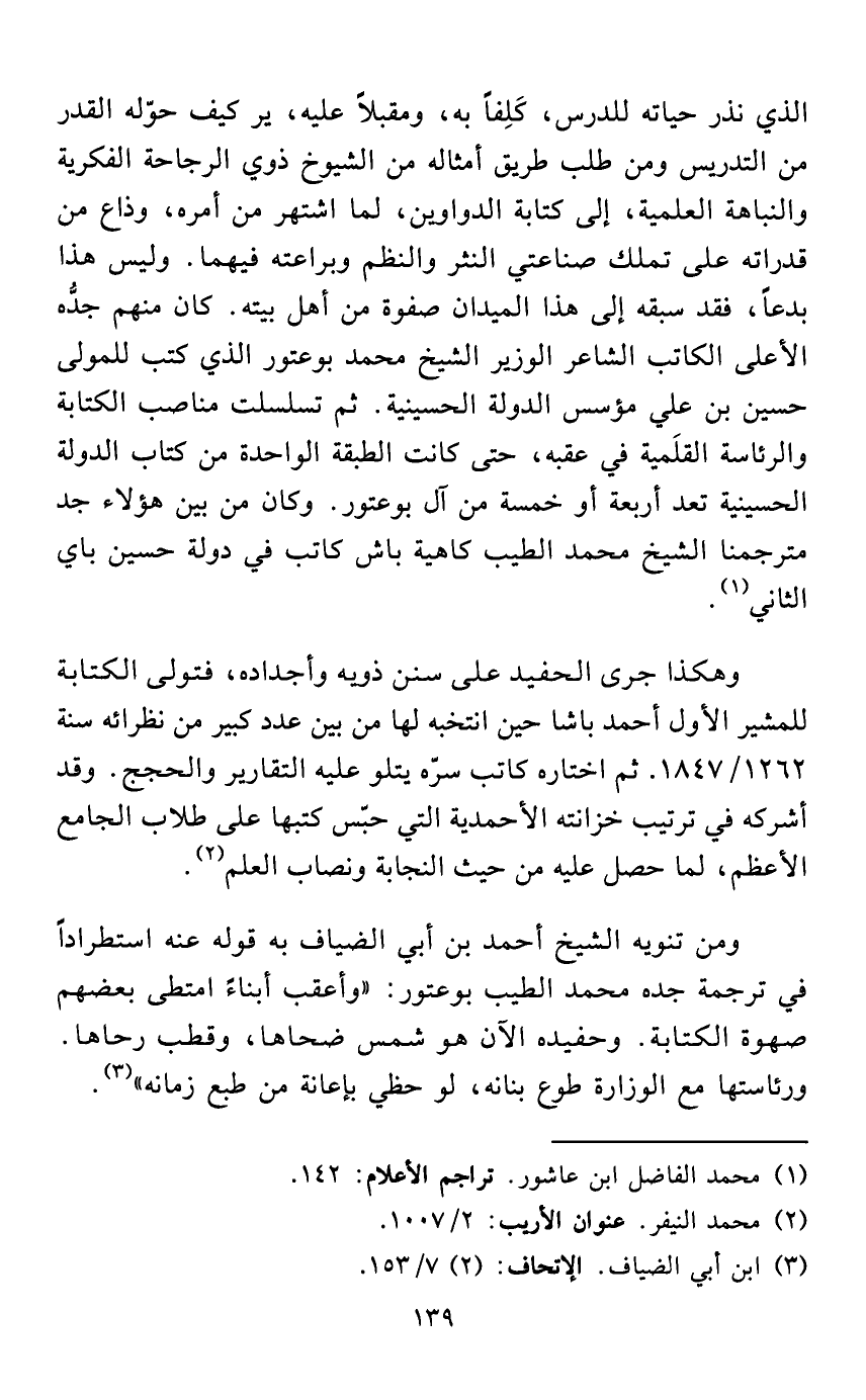 الذي نذر حياته للدرس، كَلِفاً به، ومقبلاً عليه، ير كيف حوّله القدر من التدريس ومن طلب طريق أمثاله من الشيوخ ذوي الرجاحة الفكرية والنباهة العلمية، إلى كتابة الدواوين، لما اشتهر من أمره، وذاع من قدراته على تملك صناعتي النثر والنظم وبراعته فيهما. وليس هذا بدعاً، فقد سبقه إلى هذا الميدان صفوة من أهل بيته. كان منهم جدُّه الأعلى الكاتب الشاعر الوزير الشيخ محمد بوعتور الذي كتب للمولى حسين بن علي مؤسس الدولة الحسينية. ثم تسلسلت مناصب الكتابة والرئاسة القلَمية في عقبه، حتى كانت الطبقة الواحدة من كتاب الدولة الحسينية تعد أربعة أو خمسة من آل بوعتور. وكان من بين هؤلاء جد مترجمنا الشيخ محمد الطيب كاهية باش كاتب في دولة حسين باي الثاني (¬1).