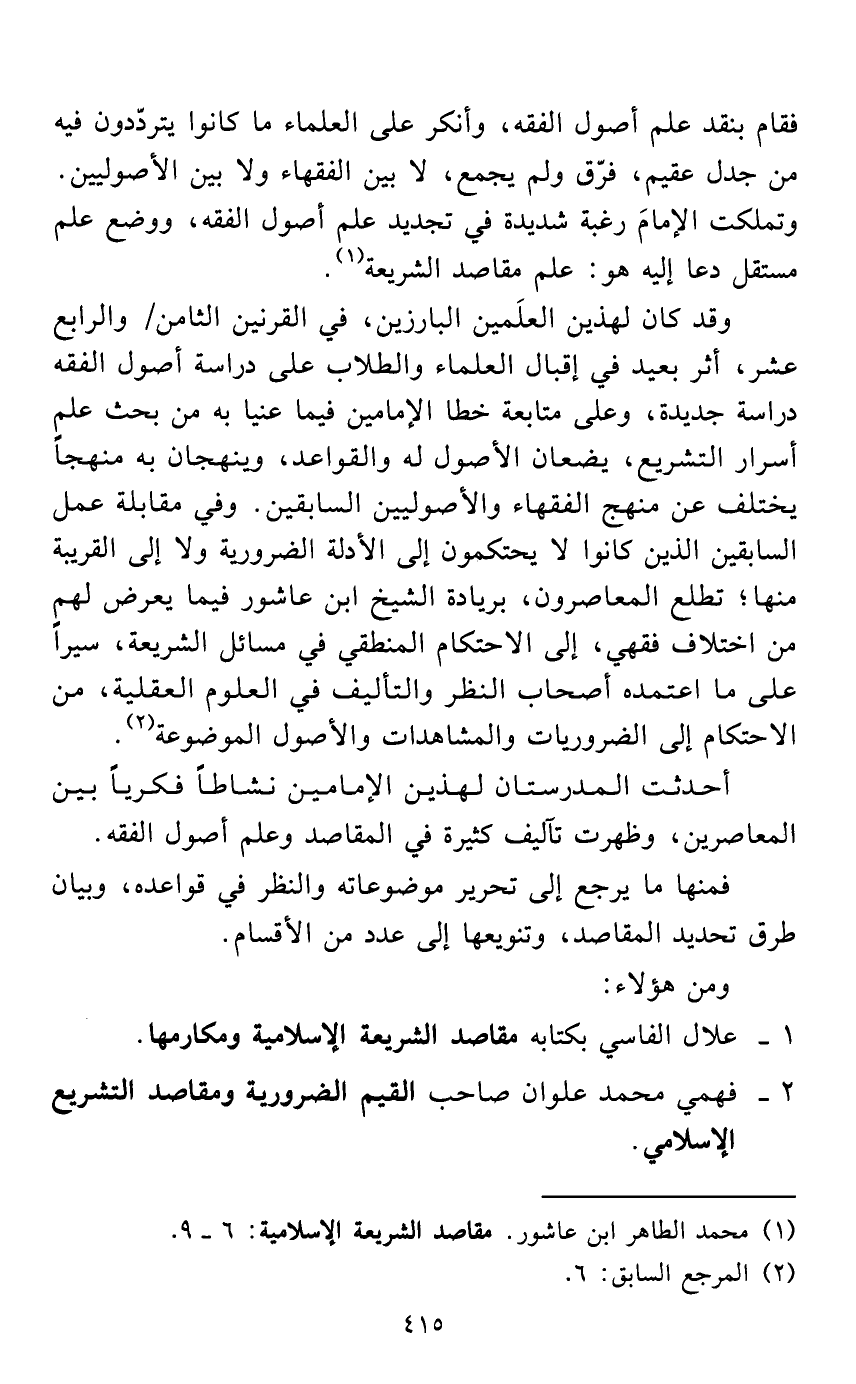 وقد كان لهذين العلَمين البارزين، في القرنين الثامن والرابع عشر، أثر بعيد في إقبال العلماء والطلاب على دراسة أصول الفقه دراسة جديدة، وعلى متابعة خطا الإمامين فيما عنيا به من بحث علم أسرار التشريع، يضعان الأصول له والقواعد، وينهجان به منهجاً يختلف عن منهج الفقهاء والأصوليين السابقين. وفي مقابلة عمل السابقين الذين كانوا لا يحتكمون إلى الأدلة الضرورية ولا إلى القريبة منها؛ تطلع المعاصرون، بريادة الشيخ ابن عاشور فيما يعرض لهم من اختلاف فقهي، إلى الاحتكام المنطقي في مسائل الشريعة، سيراً على ما اعتمده أصحاب النظر والتأليف في العلوم العقلية، من الاحتكام إلى الضروريات والمشاهدات والأصول الموضوعة (¬2).