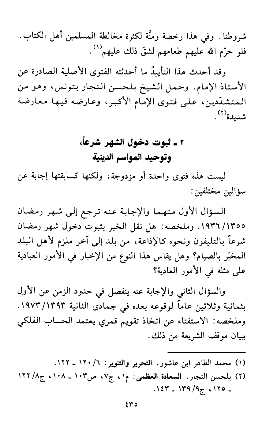 السؤال الأول منهما والإجابة عنه ترجع إلى شهر رمضان 1355/ 1936. وملخصه: هل نقل الخبر بثبوت دخول شهر رمضان شرعاً بالتليفون ونحوه كالإذاعة، من بلد إلى آخر ملزم لأهل البلد المخبَر بالصيام؟ وهل يقاس هذا النوع من الإخبار في الأمور العبادية على مثله في الأمور العادية؟