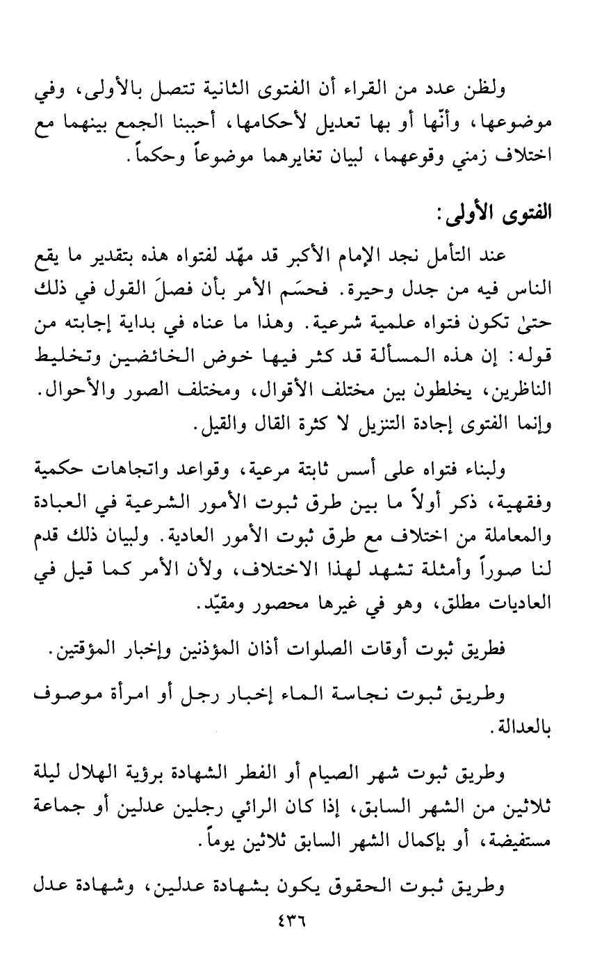 ولبناء فتواه على أسس ثابتة مرعية، وقواعد واتجاهات حكمية وفقهية، ذكر أولاً ما بين طرق ثبوت الأمور الشرعية في العبادة والمعاملة من اختلاف مع طرق ثبوت الأمور العادية. ولبيان ذلك قدم لنا صوراً وأمثلة تشهد لهذا الاختلاف، ولأن الأمر كما قيل في العاديات مطلق، وهو في غيرها محصور ومقيّد.