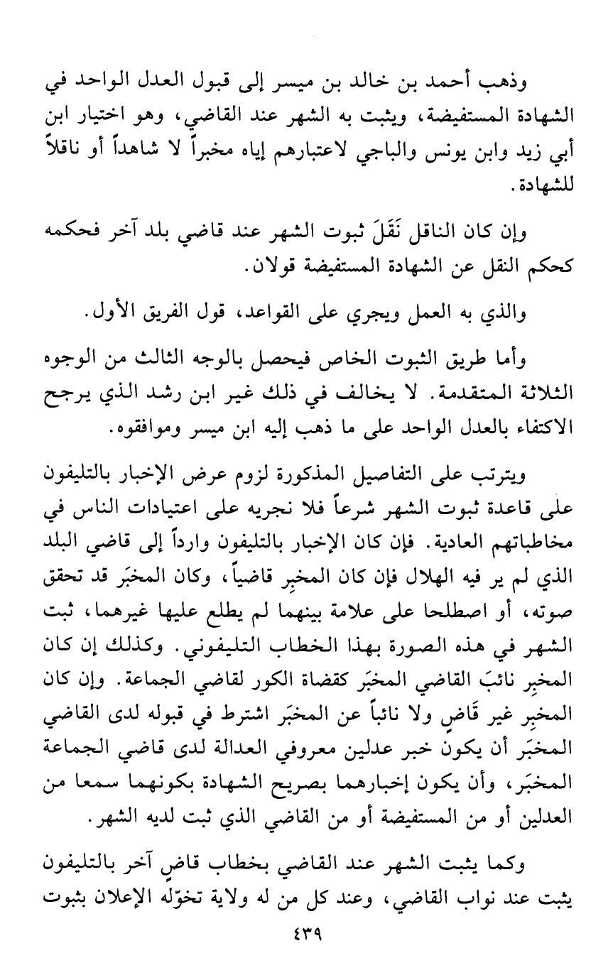 وذهب أحمد بن خالد بن ميسر إلى قبول العدل الواحد في الشهادة المستفيضة، ويثبت به الشهر عند القاضي، وهو اختيار ابن أبي زيد وابن يونس والباجي لاعتبارهم إياه مخبراً لا شاهداً أو ناقلاً للشهادة.