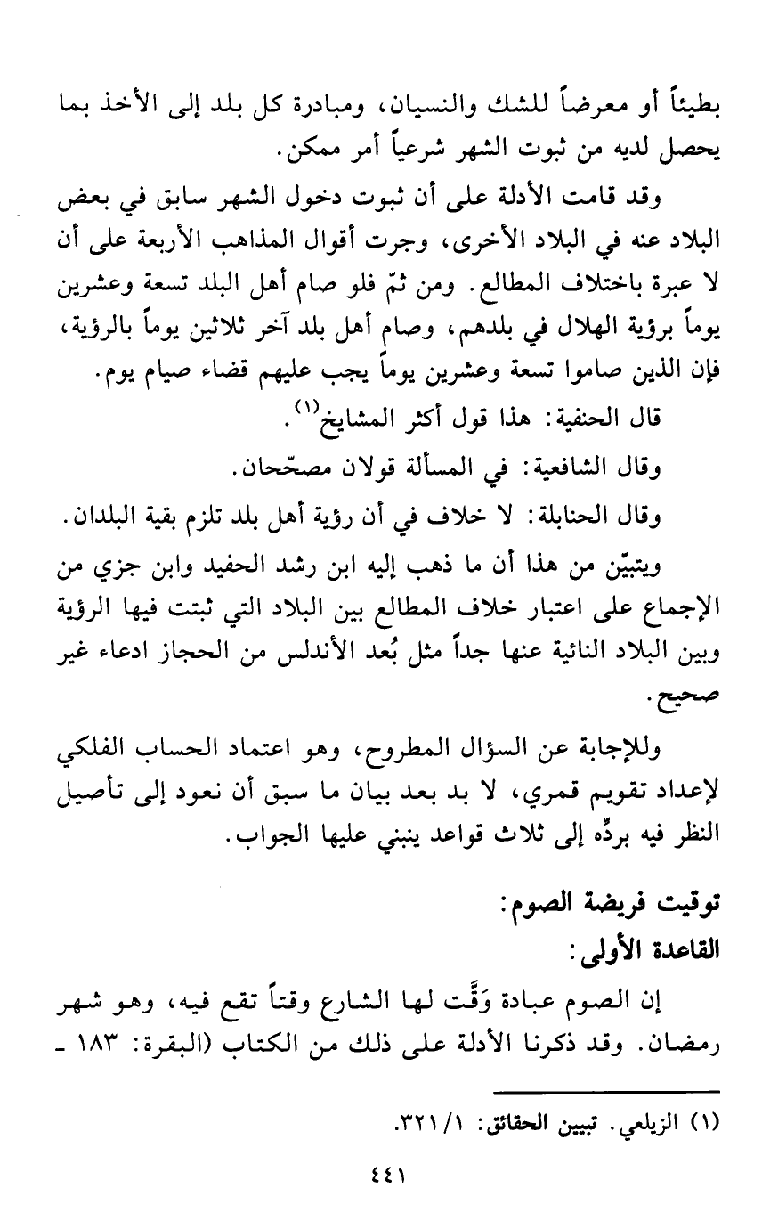 وقد قامت الأدلة على أن ثبوت دخول الشهر سابق في بعض البلاد عنه في البلاد الأخرى، وجرت أقوال المذاهب الأربعة على أن لا عبرة باختلاف المطالع. ومن ثمّ فلو صام أهل البلد تسعة وعشرين يوماً برؤية الهلال في بلدهم، وصام أهل بلد آخر ثلاثين يوماً بالرؤية، فإن الذين صاموا تسعة وعشرين يوماً يجب عليهم قضاء صيام يوم.