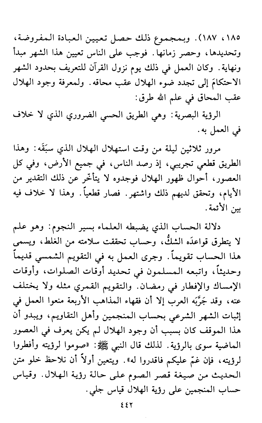 185، 187). وبمجموع ذلك حصل تعيين العبادة المفروضة، وتحديدها، وحصر زمانها. فوجب على الناس تعيين هذا الشهر مبدأ ونهاية. وكان العمل في ذلك يوم نزول القرآن للتعريف بحدود الشهر الاحتكامَ إلى تجدد ضوء الهلال عقب محاقه. ولمعرفة وجود الهلال عقب المحاق في علم الله طرق: