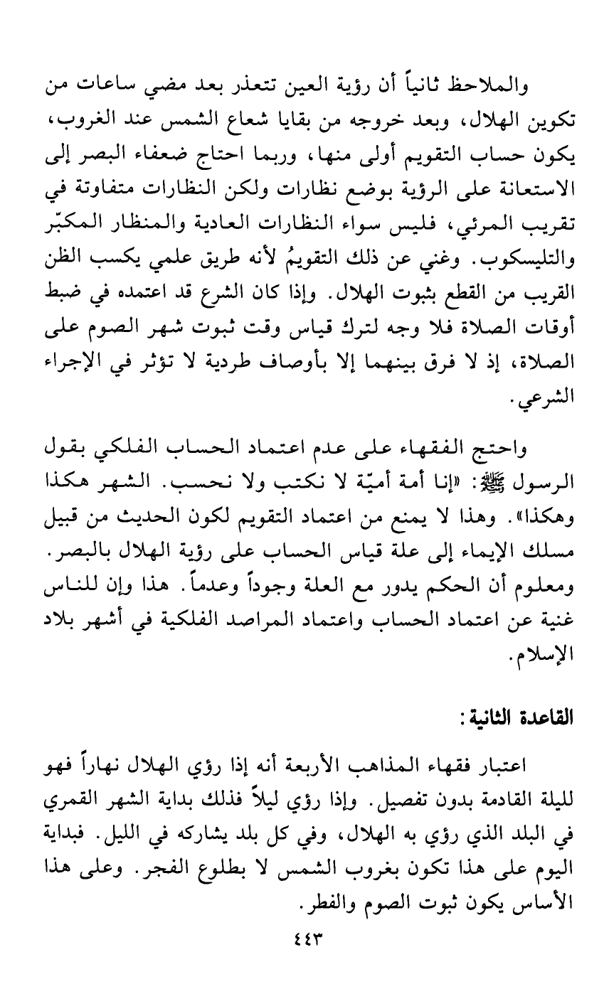 واحتج الفقهاء على عدم اعتماد الحساب الفلكي بقول الرسول - صلى الله عليه وسلم -: "إنا أمة أميّة لا نكتب ولا نحسب. الشهر هكذا وهكذا". وهذا لا يمنع من اعتماد التقويم لكون الحديث من قبيل مسلك الإيماء إلى علة قياس الحساب على رؤية الهلال بالبصر. ومعلوم أن الحكم يدور مع العلة وجوداً وعدماً. هذا وإن للناس غنية عن اعتماد الحساب واعتماد المراصد الفلكية في أشهر بلاد الإسلام.