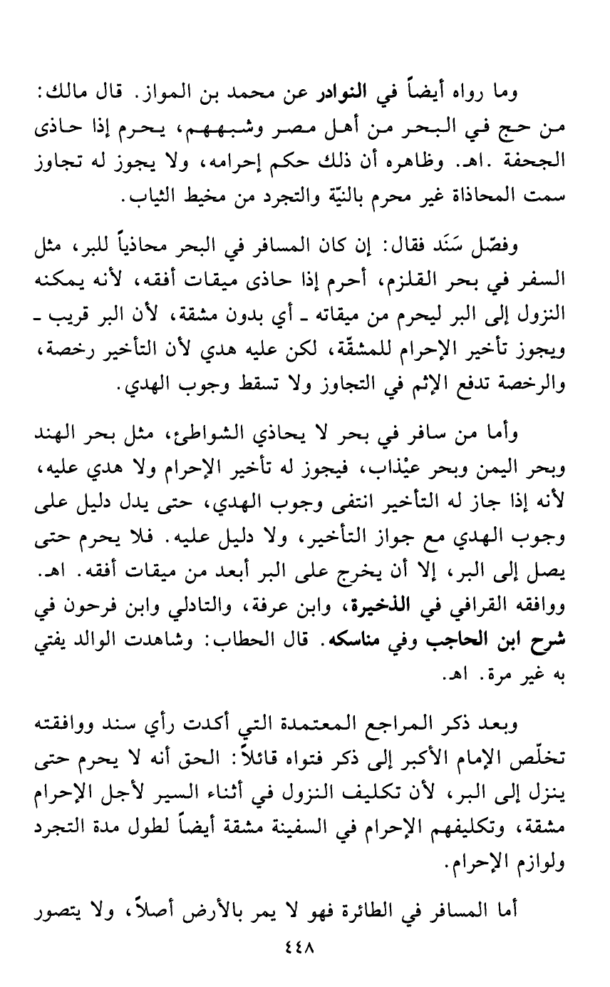 وما رواه أيضاً في النوادر عن محمد بن المواز. قال مالك: من حج في البحر من أهل مصر وشبههم، يحرم إذا حاذى الجحفة. اهـ. وظاهره أن ذلك حكم إحرامه، ولا يجوز له تجاوز سمت المحاذاة غير محرم بالنيّة والتجرد من مخيط الثياب.