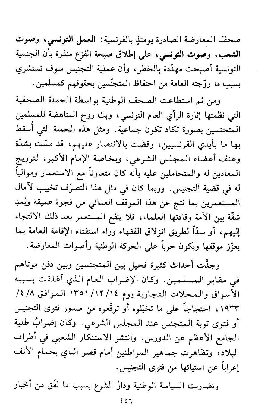 صحفَ المعارضة الصادرة يومئذٍ بالفرنسية: العمل التونسي، وصوت الشعب، وصوت التونسي، على إطلاق صيحة الفزع منذرة بأن الجنسية التونسية أصبحت مهدّدة بالخطر، وأن عملية التجنيس سوف تستشري بسبب ما روّجته العامة من احتفاظ المتجنّسين بحقوقهم كمسلمين.