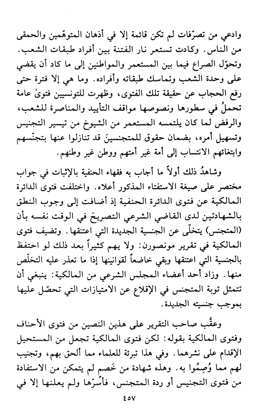 وادعي من تصرّفات لم تكن قائمة إلا في أذهان المتوهّمين والحمقى من الناس. وكادت تستعر نار الفتنة بين أفراد طبقات الشعب. وتحوّل الصراع فيما بين المستعمر والمواطنين إلى ما كاد أن يقضي على وحدة الشعب وتماسك طبقاته وأفراده. وما هي إلا فترة حتى رفع الحجاب عن حقيقة تلك الفتوى، وظهرت للتونسيين فتوى عامة تحملُ في سطورها ونصوصها مواقف التأييد والمناصرة للشعب، والرفض لما كان يلتمسه المستعمر من الشيوخ من تيسير التجنيس وتسهيل أمره، بضمان حقوق للمتجنسينَ قد تنازلوا عنها بتجنّسهم وابتغائهم الانتساب إلى أمة غير أمتهم ووطن غير وطنهم.