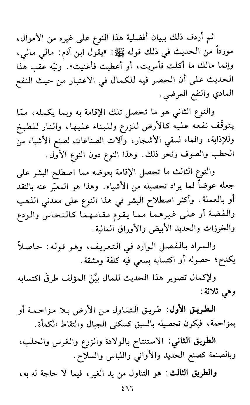 ثم أردف ذلك ببيان أفضلية هذا النوع على غيره من الأموال، مورداً من الحديث في ذلك قوله - صلى الله عليه وسلم -: "يقول ابن آدم: مالي مالي، وإنما مالك ما أكلت فأمريت، أو أعطيت فأغنيت". ونبّه عقب هذا الحديث على أن الحصر فيه للكمال في الاعتبار من حيث النفع المادي والنفع العرضي.