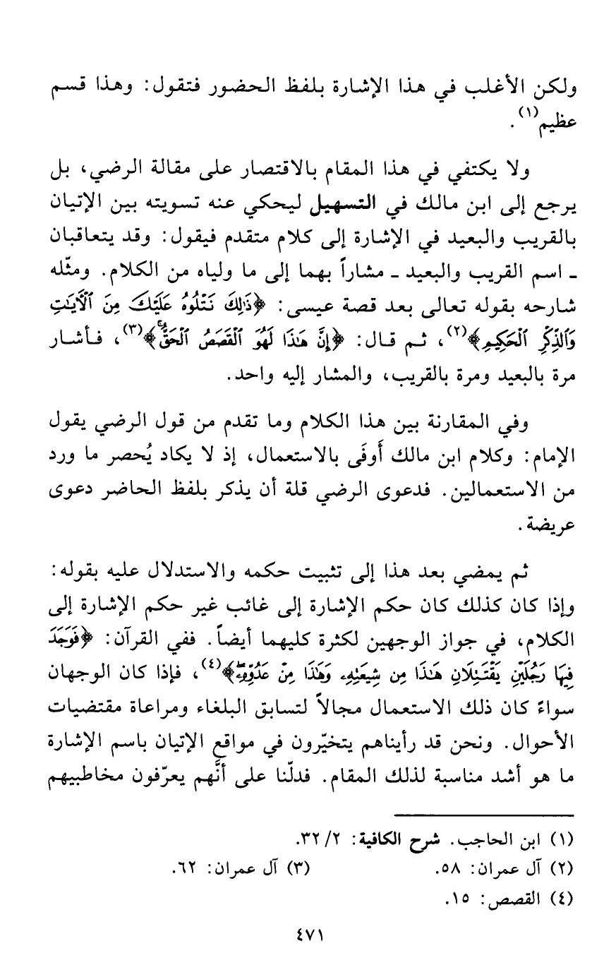ولا يكتفي في هذا المقام بالاقتصار على مقالة الرضي، بل يرجع إلى ابن مالك في التسهيل ليحكي عنه تسويته بين الإتيان بالقريب والبعيد في الإشارة إلى كلام متقدم فيقول: وقد يتعاقبان - اسم القريب والبعيد - مشاراً بهما إلى ما ولياه من الكلام. ومثّله شارحه بقوله تعالى بعد قصة عيسى: {ذَلِكَ نَتْلُوهُ عَلَيْكَ مِنَ الْآيَاتِ وَالذِّكْرِ الْحَكِيمِ} (¬2)، ثم قال: {إِنَّ هَذَا لَهُوَ الْقَصَصُ الْحَقُّ} (¬3)، فأشار مرة بالبعيد ومرة بالقريب، والمشار إليه واحد.