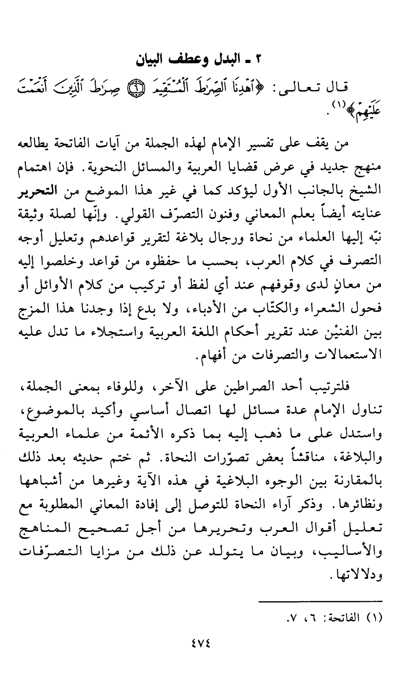 من يقف على تفسير الإمام لهذه الجملة من آيات الفاتحة يطالعه منهج جديد في عرض قضايا العربية والمسائل النحوية. فإن اهتمام الشيخ بالجانب الأول ليؤكد كما في غير هذا الموضع من التحرير عنايته أيضاً بعلم المعاني وفنون التصرّف القولي. وإنّها لصلة وثيقة نبّه إليها العلماء من نحاة ورجال بلاغة لتقرير قواعدهم وتعليل أوجه التصرف في كلام العرب، بحسب ما حفظوه من قواعد وخلصوا إليه من معانٍ لدى وقوفهم عند أي لفظ أو تركيب من كلام الأوائل أو فحول الشعراء والكتّاب من الأدباء، ولا بدع إذا وجدنا هذا المزج بين الفنيْن عند تقرير أحكام اللغة العربية واستجلاء ما تدل عليه الاستعمالات والتصرفات من أفهام.