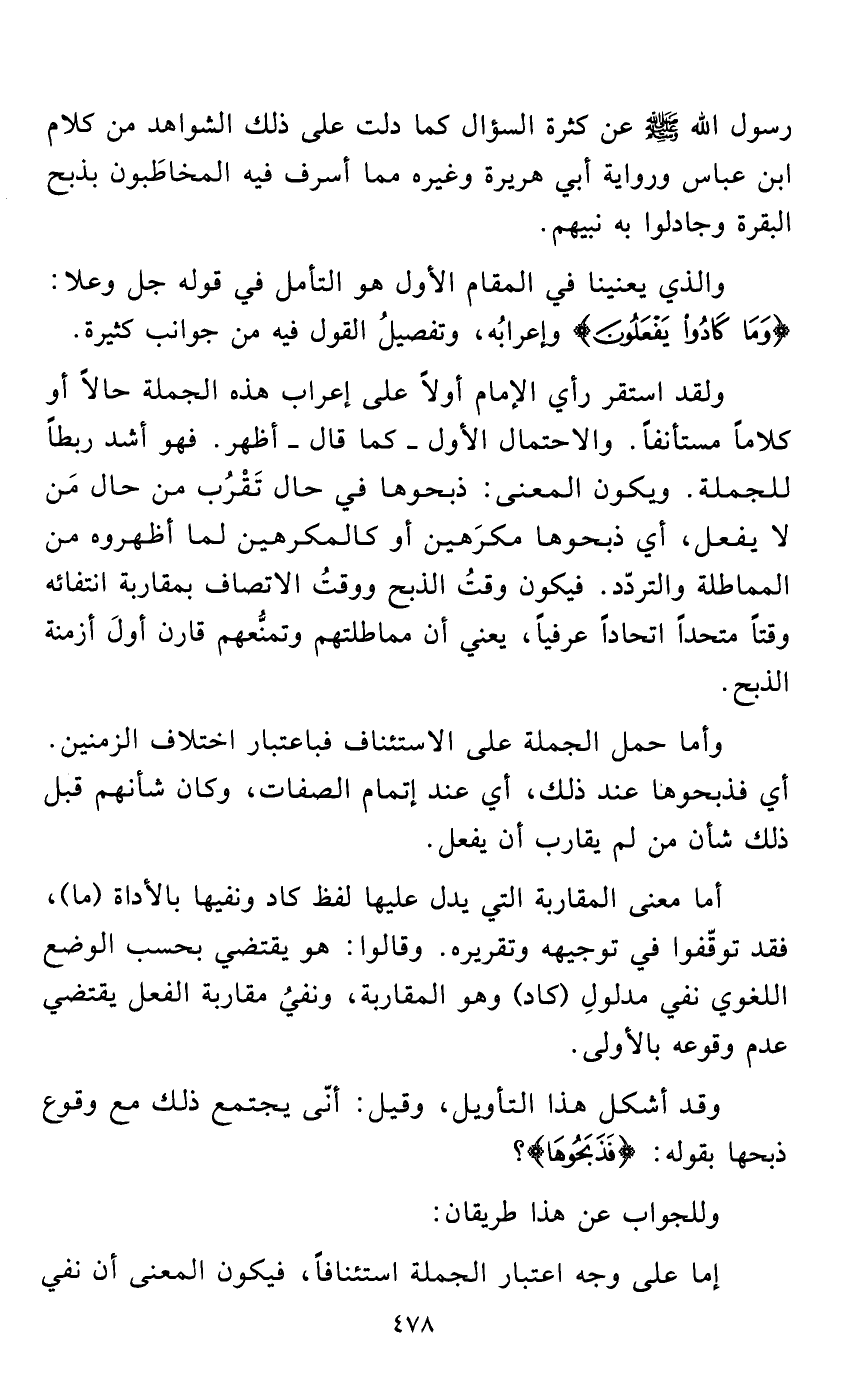 ولقد استقر رأي الإمام أولاً على إعراب هذه الجملة حالاً أو كلاماً مستأنفاً. والاحتمال الأول - كما قال - أظهر. فهو أشد ربطاً للجملة. ويكون المعنى: ذبحوها في حال تَقْرُب من حال مَن لا يفعل، أي ذبحوها مكرَهين أو كالمكرهين لما أظهروه من المماطلة والتردّد. فيكون وقتُ الذبح ووقتُ الاتصاف بمقاربة انتفائه وقتاً متحداً اتحاداً عرفياً، يعني أن مماطلتهم وتمنُّعهم قارن أولَ أزمنة الذبح.