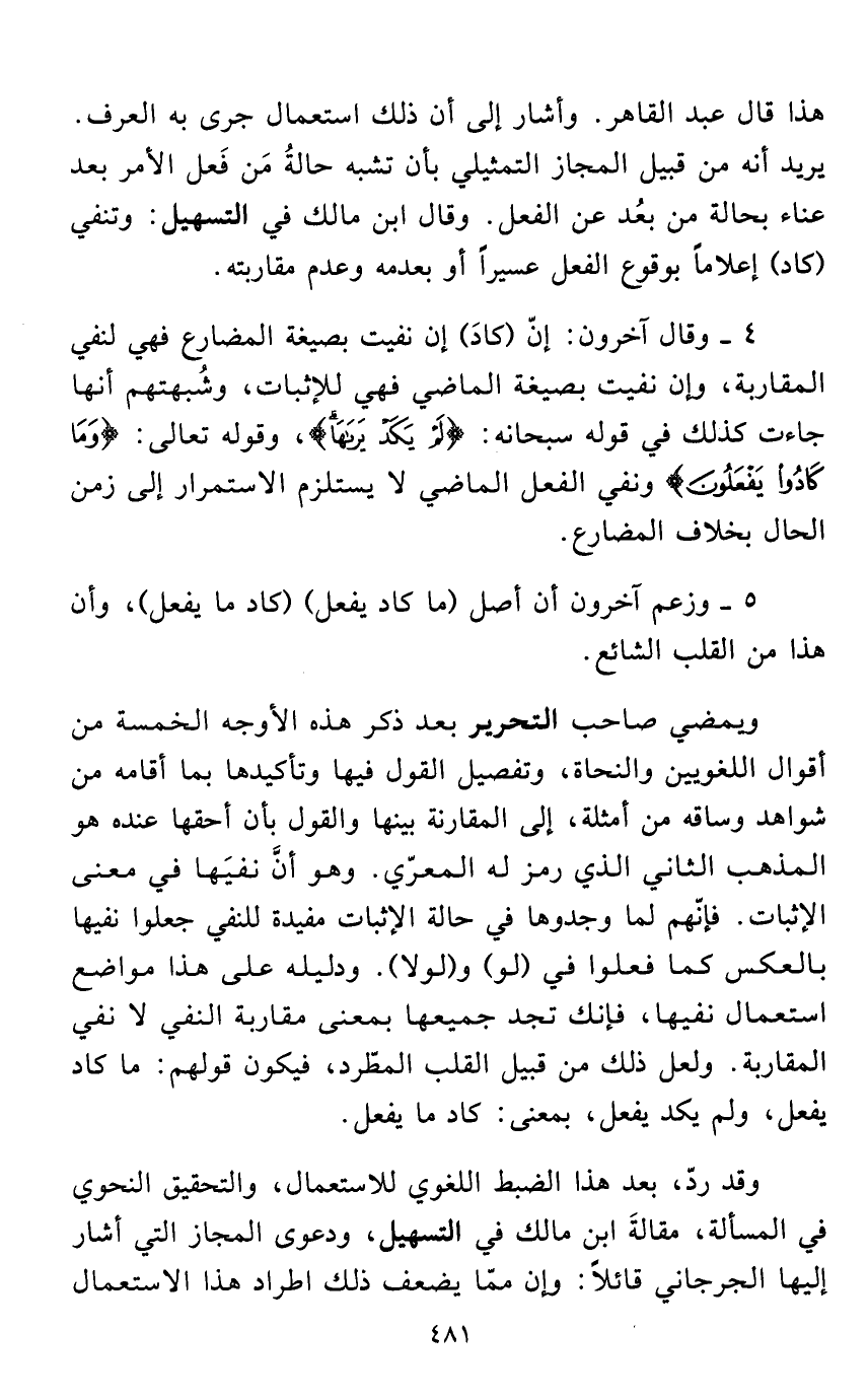 هذا قال عبد القاهر. وأشار إلى أن ذلك استعمال جرى به العرف. يريد أنه من قبيل المجاز التمثيلي بأن تشبه حالةُ مَن فَعل الأمر بعد عناء بحالة من بعُد عن الفعل. وقال ابن مالك في التسهيل: وتنفي (كاد) إعلاماً بوقوع الفعل عسيراً أو بعدمه وعدم مقاربته.