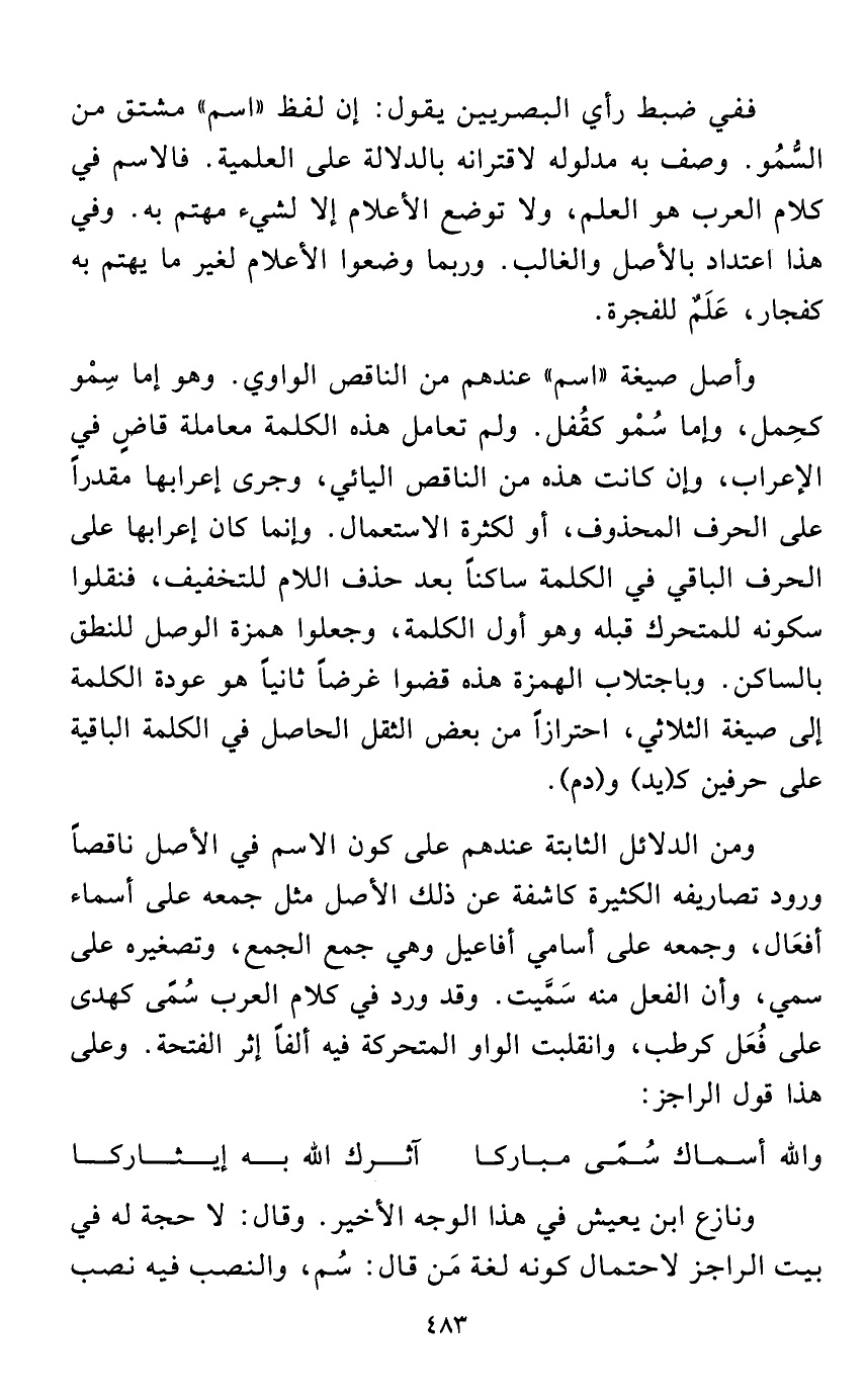 ففي ضبط رأي البصريين يقول: إن لفظ "اسم" مشتق من السُّمُو. وصف به مدلوله لاقترانه بالدلالة على العلمية. فالاسم في كلام العرب هو العلم، ولا توضع الأعلام إلا لشيء مهتم به. وفي هذا اعتداد بالأصل والغالب. وربما وضعوا الأعلام لغير ما يهتم به كفجار، عَلَمٌ للفجرة.