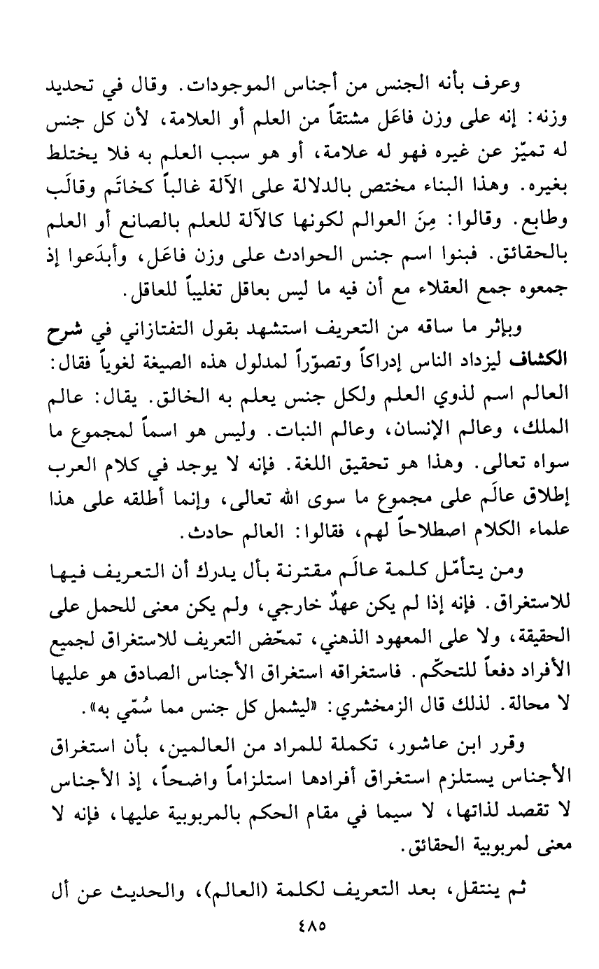 وبإثر ما ساقه من التعريف استشهد بقول التفتازاني في شرح الكشاف ليزداد الناس إدراكاً وتصوّراً لمدلول هذه الصيغة لغوياً فقال: العالم اسم لذوي العلم ولكل جنس يعلم به الخالق. يقال: عالم الملك، وعالم الإنسان، وعالم النبات. وليس هو اسماً لمجموع ما سواه تعالى. وهذا هو تحقيق اللغة. فإنه لا يوجد في كلام العرب إطلاق عالَم على مجموع ما سوى الله تعالى، وإنما أطلقه على هذا علماء الكلام اصطلاحاً لهم، فقالوا: العالم حادث.