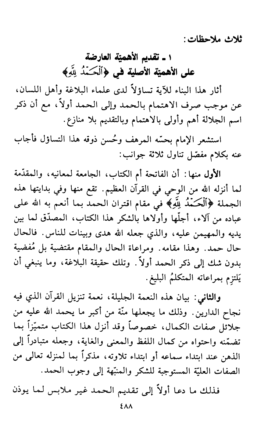 1 - تقديم الأهميّة العارضة على الأهميّة الأصلية في {الْحَمْدُ لِلَّهِ}