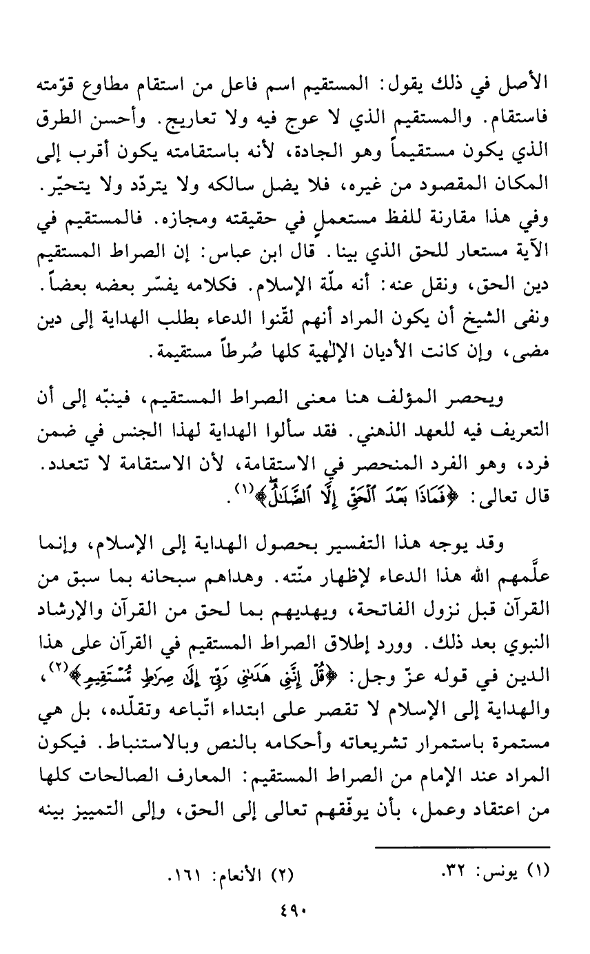 ويحصر المؤلف هنا معنى الصراط المستقيم، فينبّه إلى أن التعريف فيه للعهد الذهني. فقد سألوا الهداية لهذا الجنس في ضمن فرد، وهو الفرد المنحصر في الاستقامة، لأن الاستقامة لا تتعدد. قال تعالى: {فَمَاذَا بَعْدَ الْحَقِّ إِلَّا الضَّلَالُ} (¬1).