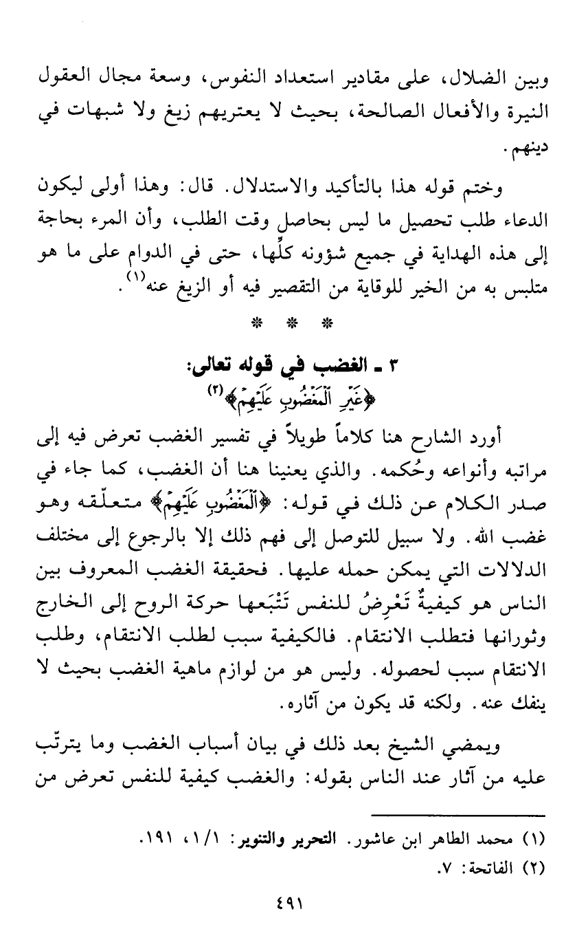 أورد الشارح هنا كلاماً طويلاً في تفسير الغضب تعرض فيه إلى مراتبه وأنواعه وحُكمه. والذي يعنينا هنا أن الغضب، كما جاء في صدر الكلام عن ذلك في قوله: {الْمَغْضُوبِ عَلَيْهِمْ} متعلّقه وهو غضب الله. ولا سبيل للتوصل إلى فهم ذلك إلا بالرجوع إلى مختلف الدلالات التي يمكن حمله عليها. فحقيقة الغضب المعروف بين الناس هو كيفيةٌ تَعْرِضُ للنفس تَتْبَعها حركة الروح إلى الخارج وثورانها فتطلب الانتقام. فالكيفية سبب لطلب الانتقام، وطلب الانتقام سبب لحصوله. وليس هو من لوازم ماهية الغضب بحيث لا ينفك عنه. ولكنه قد يكون من آثاره.