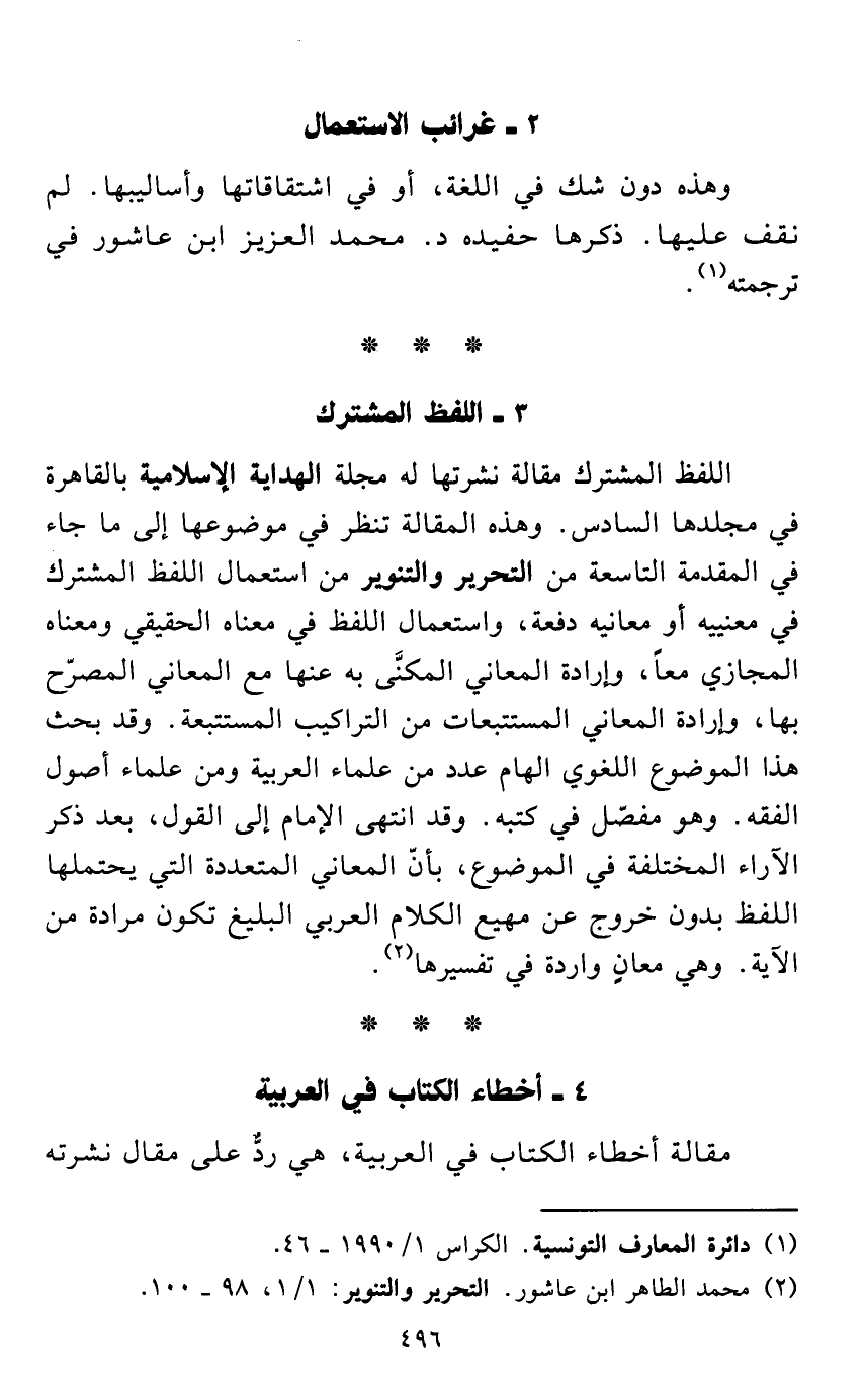 اللفظ المشترك مقالة نشرتها له مجلة الهداية الإسلامية بالقاهرة في مجلدها السادس. وهذه المقالة تنظر في موضوعها إلى ما جاء في المقدمة التاسعة من التحرير والتنوير من استعمال اللفظ المشترك في معنييه أو معانيه دفعة، واستعمال اللفظ في معناه الحقيقي ومعناه المجازي معاً، وإرادة المعاني المكنَّى به عنها مع المعاني المصرّح بها، وإرادة المعاني المستتبعات من التراكيب المستتبعة. وقد بحث هذا الموضوع اللغوي الهام عدد من علماء العربية ومن علماء أصول الفقه. وهو مفصّل في كتبه. وقد انتهى الإمام إلى القول، بعد ذكر الآراء المختلفة في الموضوع، بأنّ المعاني المتعددة التي يحتملها اللفظ بدون خروج عن مهيع الكلام العربي البليغ تكون مرادة من الآية. وهي معانٍ واردة في تفسيرها (¬2).