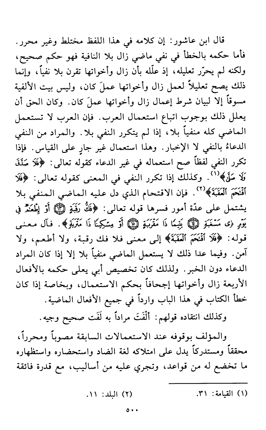 قال ابن عاشور: إن كلامه في هذا اللفظ مختلط وغير محرر. فأما حكمه بالخطأ في نفي ماضي زال بلا النافية فهو حكم صحيح، ولكنه لم يحرّر تعليله، إذ علّله بأن زال وأخواتها تقرن بلا نفياً، وإنما ذلك يصح تعليلاً لعمل زال وأخواتها عملَ كان، وليس بيت الألفية مسوقاً إلا لبيان شرط إعمال زال وأخواتها عملَ كان. وكان الحق أن يعلل ذلك بوجوب اتباع استعمال العرب. فإن العرب لا تستعمل الماضي كله منفياً بلا، إذا لم يتكرر النفي بلا. والمراد من النفي الدعاءُ بالنفي لا الإخبار. وهذا استعمال غير جارٍ على القياس. فإذا تكرر النفي لفظاً صح استعماله في غير الدعاء كقوله تعالى: {فَلَا صَدَّقَ وَلَا صَلَّى} (¬1). وكذلك إذا تكرر النفي في المعنى كقوله تعالى: {فَلَا اقْتَحَمَ الْعَقَبَةَ} (¬2). فإن الاقتحام الذي دل عليه الماضي المنفي بلا يشتمل على عدّة أمور فسرها قوله تعالى: {فَكُّ رَقَبَةٍ (13) أَوْ إِطْعَامٌ فِي يَوْمٍ ذِي مَسْغَبَةٍ (14) يَتِيمًا ذَا مَقْرَبَةٍ (15) أَوْ مِسْكِينًا ذَا مَتْرَبَةٍ}. فآل معنى قوله: {فَلَا اقْتَحَمَ الْعَقَبَةَ} إلى معنى فلا فك رقبة، ولا أطعم، ولا آمن. وفيما عدا ذلك لا يستعمل الماضي منفياً بلا إلا إذا كان المراد الدعاء دون الخبر. ولذلك كان تخصيص أبي يعلى حكمه بالأفعال الأربعة زال وأخواتها إجحافاً بحكم الاستعمال، وبخاصة إذا كان خطأ الكتاب في هذا الباب وارداً في جميع الأفعال الماضية.