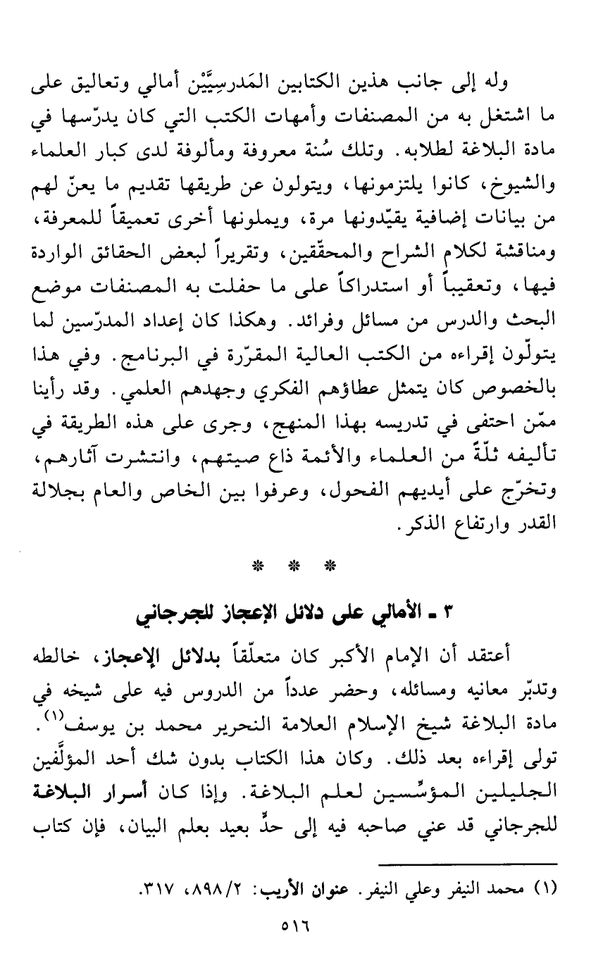 أعتقد أن الإمام الأكبر كان متعلّقاً بدلائل الإعجاز، خالطه وتدبّر معانيه ومسائله، وحضر عدداً من الدروس فيه على شيخه في مادة البلاغة شيخ الإسلام العلامة النحرير محمد بن يوسف (¬1). تولى إقراءه بعد ذلك. وكان هذا الكتاب بدون شك أحد المؤلَّفين الجليلين المؤسِّسين لعلم البلاغة. وإذا كان أسرار البلاغة للجرجاني قد عني صاحبه فيه إلى حدٍّ بعيد بعلم البيان، فإن كتاب