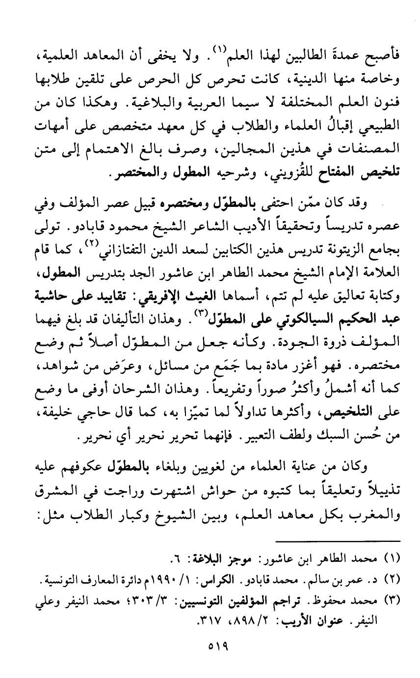 فأصبح عمدةَ الطالبين لهذا العلم (¬1). ولا يخفى أن المعاهد العلمية، وخاصة منها الدينية، كانت تحرص كل الحرص على تلقين طلابها فنون العلم المختلفة لا سيما العربية والبلاغية. وهكذا كان من الطبيعي إقبالُ العلماء والطلاب في كل معهد متخصص على أمهات المصنفات في هذين المجالين، وصرف بالغ الاهتمام إلى متن تلخيص المفتاح للقُزويني، وشرحيه المطول والمختصر.