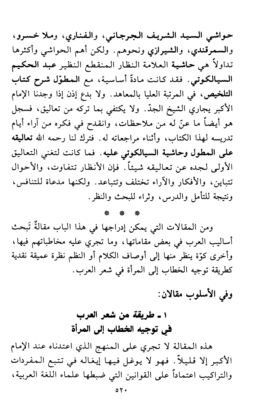 ومن المقالات التي يمكن إدراجها في هذا الباب مقالةٌ تَبحث أساليب العرب في بعض مقاماتها، وما تجري عليه مخاطباتهم فيها، وأخرى كوّة ينظر منها إلى أوصاف الكلام أو النظم نظرة عميقة نقدية كطريقة توجيه الخطاب إلى المرأة في شعر العرب.